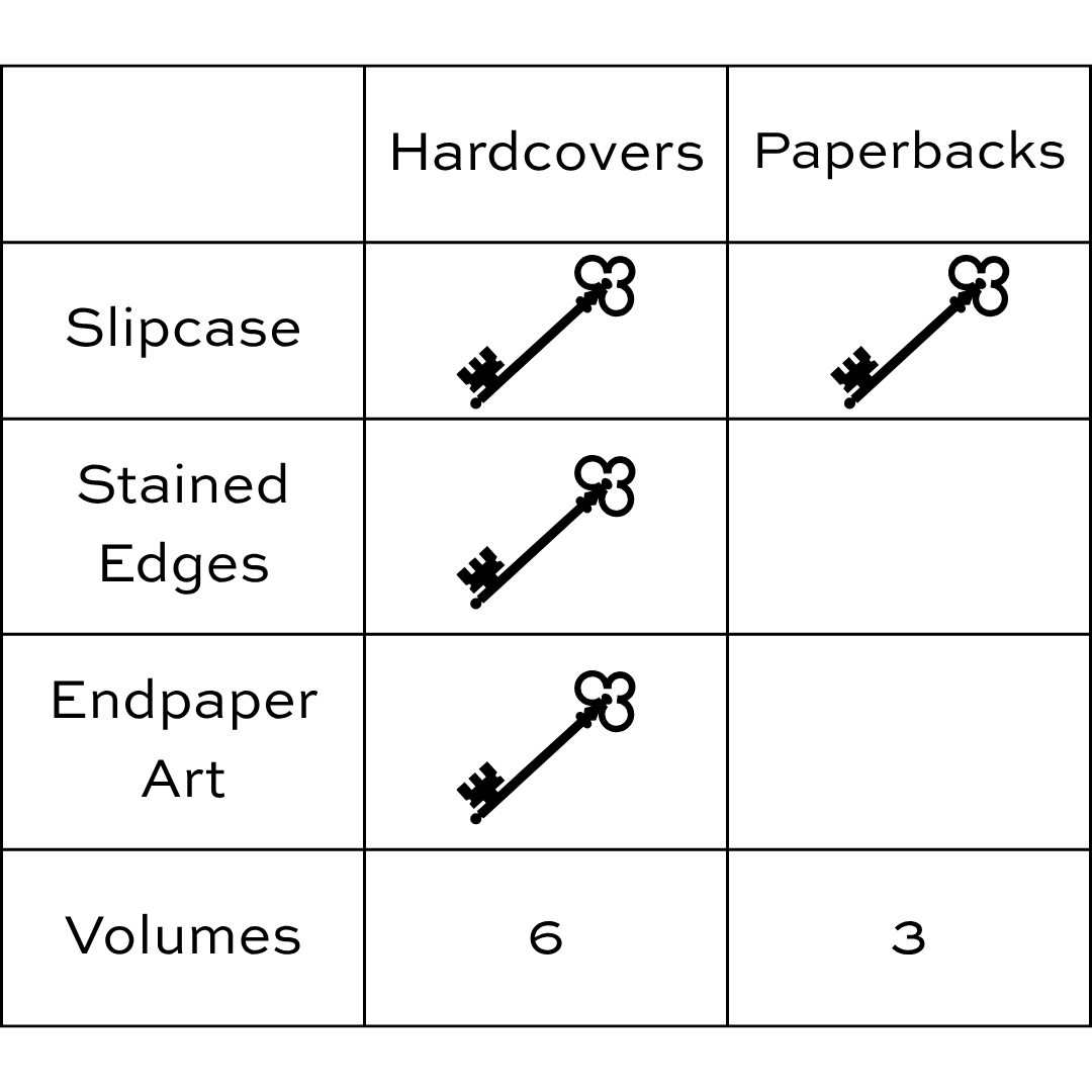 Chart. Hardcovers have 6 volumes, slipcase, stained edges, and endpaper art. Paperbacks have 3 volumes and a slipcase.