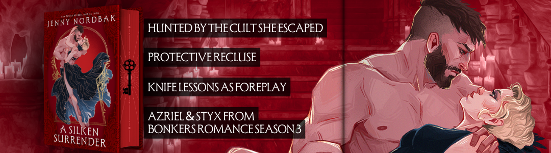 A Silken Surrender by Jenny Nordbak. Hunted by the cult she escaped. Protective recluse. Knife lessons as foreplay. Azriel & Styx from Bonkers Romance Season 3.