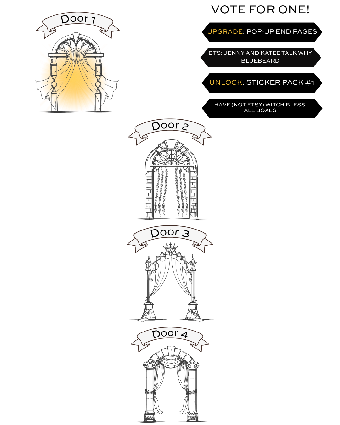 Door 1 is opened. Stretch goals: Upgrade: Pop-up endpages on the hardcovers. BTS: Jenny and Katee talk why Bluebeard. Unlock: Sticker Pack #1. Have a non-Etsy witch bless the boxes.