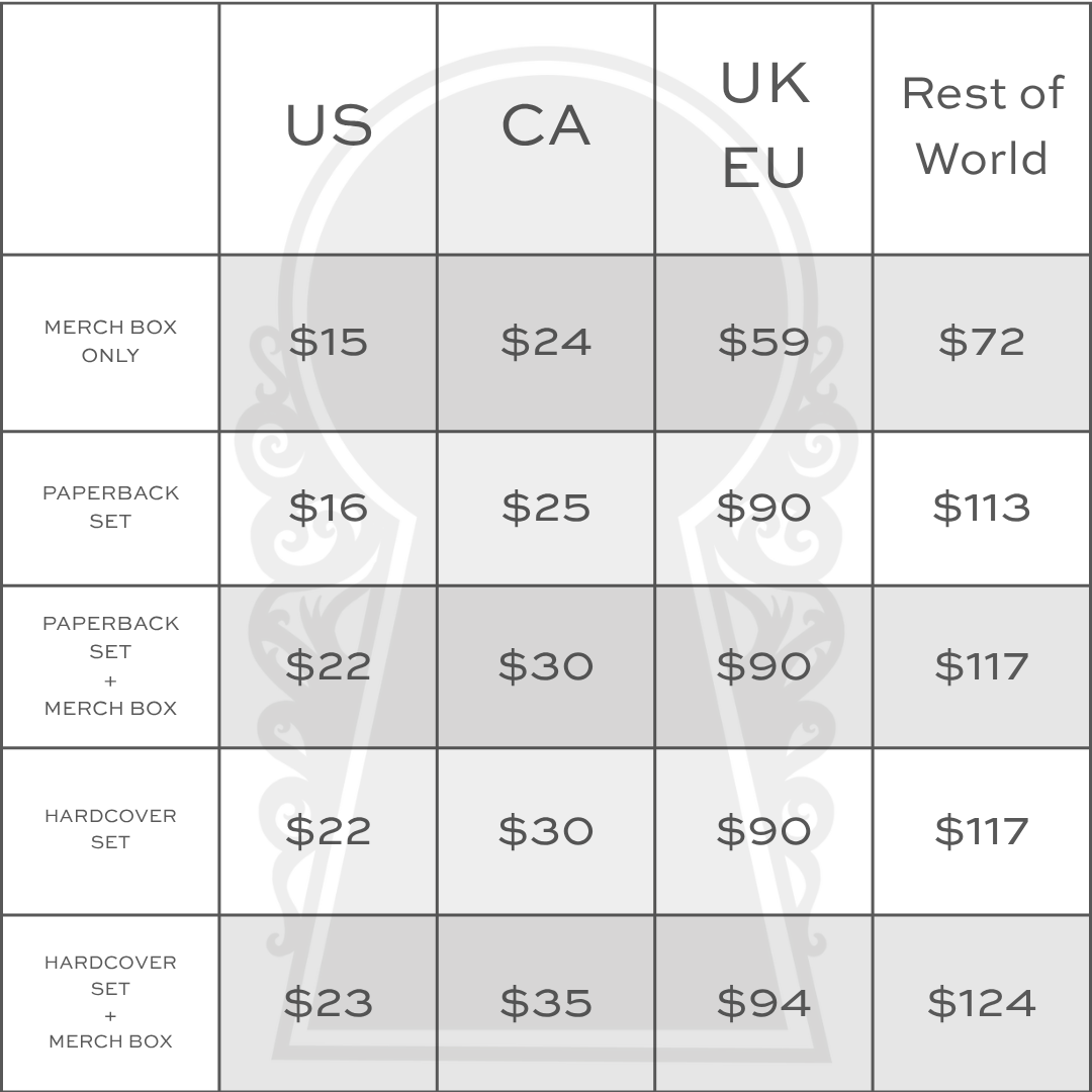 Shipping table. Merch Box Only: $15 (US), $24 (CA), $59 (UK/EU), $72 (Rest of World). Paperback set: $16 (US), $25 (CA), $90 (UK/EU), $113 (Rest of World). Paperback Set + Merch Box: $22 (US), $30 (CA), $90 (UK/EU), $117 (Rest of World). Hardcover Set: $22 (US), $30 (CA), $90 (UK/EU), $117 (Rest of World). Hardcover Set + Merch Box: $23 (US), $35 (CA), $94 (UK/EU), $124 (Rest of World).