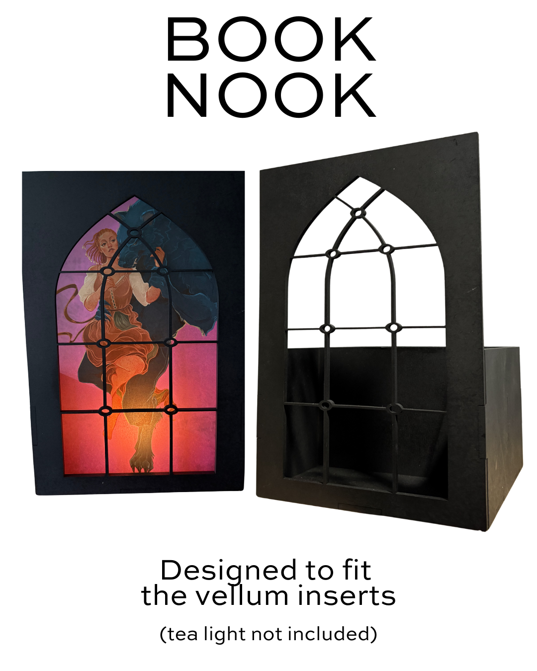 What is a book nook? It's a box designed to fit right on your shelves next to your books. If you've ever had a craving to display some of the vellum inserts we've sold in the past, this is sized to fit them all! Slip in a tea light behind, and you have all your gorgeous art on display! There is also a section in the back with storage.