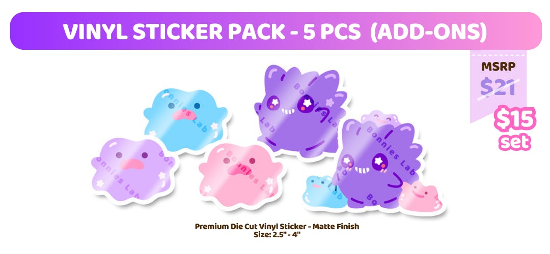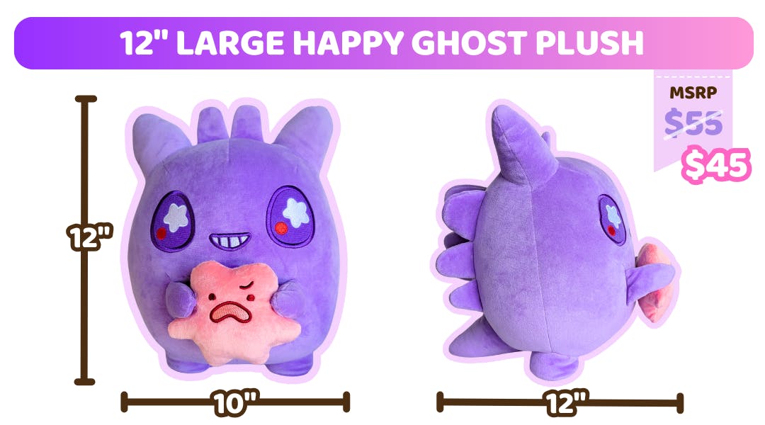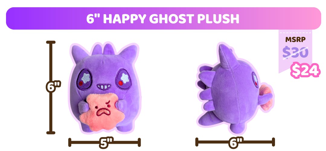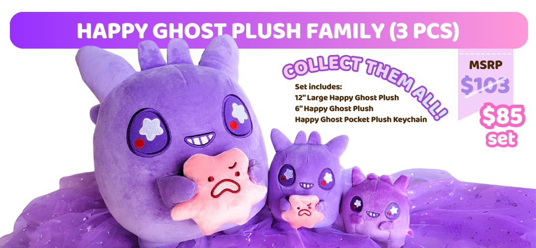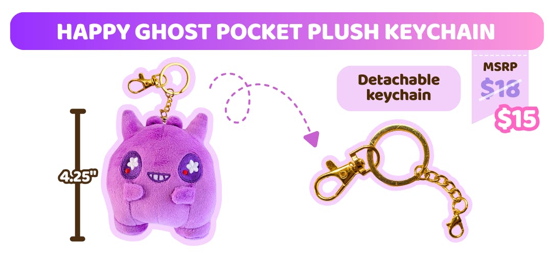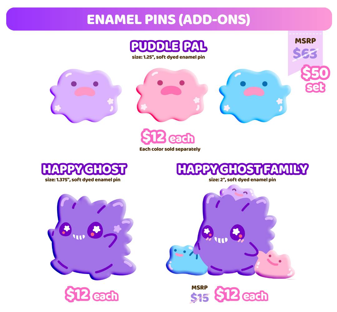 Get the full collection in one pledge! From plushies big and small to pocket keychains, pins, and stickers - this bundle has every Happy Ghost and Puddle Pal to complete your set, plus a free golden puddle pal pin! Available exclusively on BackerKit at 30% off.