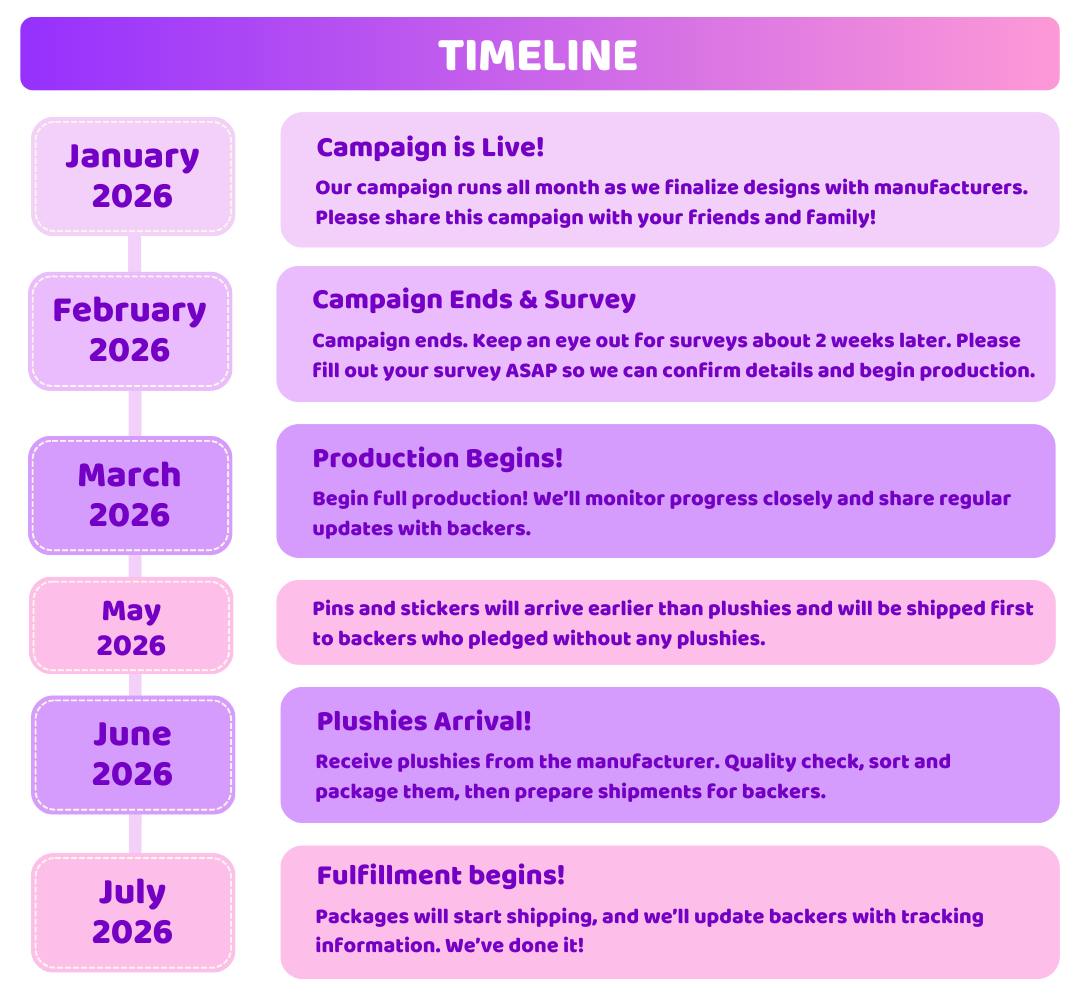 Some EU countries have very strict regulations around importing plush toys. Since this campaign includes more than just plushies (like pins and stickers), I am not excluding any regions. Please make sure you are aware of your local import rules before pledging.