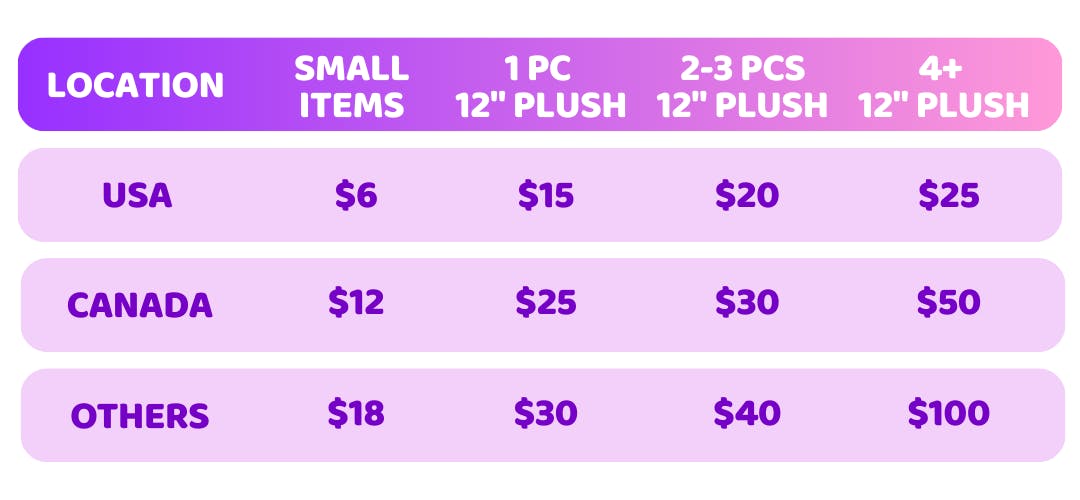 Rates vary based on item size and destination. Small items (pins, stickers, 6" plush, and pocket plush keychains) ship at a lower rate, while 12" large plushies and multi‑plush bundles have higher costs due to their size and weight.