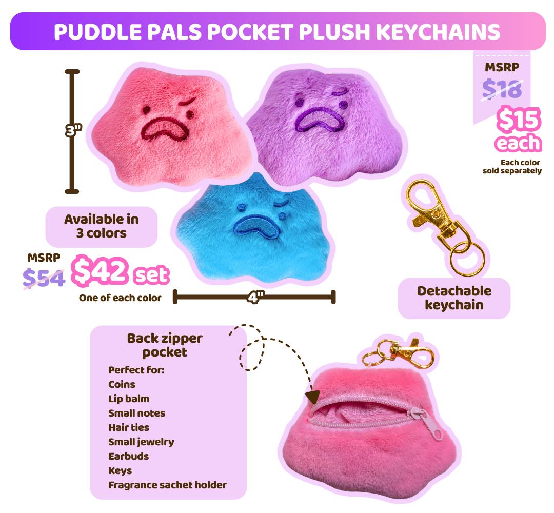 And now, Happy Ghost wants you to meet his friends: the Puddle Pals Pocket Plush, available in three colors. These little pals are perfect to tuck into your bag or keep by your side!