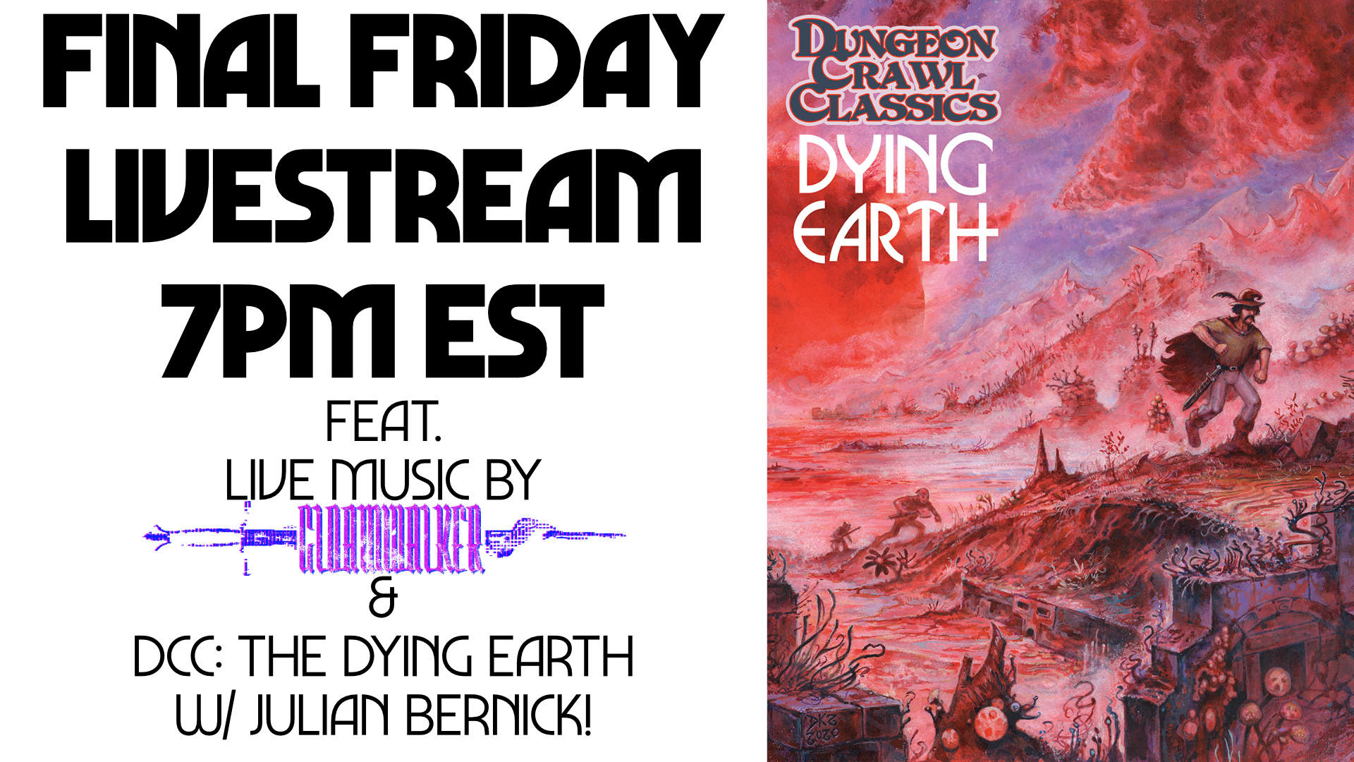 Not long after we start there will be a 20 min set of live music by Gloamwalker, followed a TTRPG liveplay of DCC: The Dying Earth as run by one of its designers, Julian Bernick!