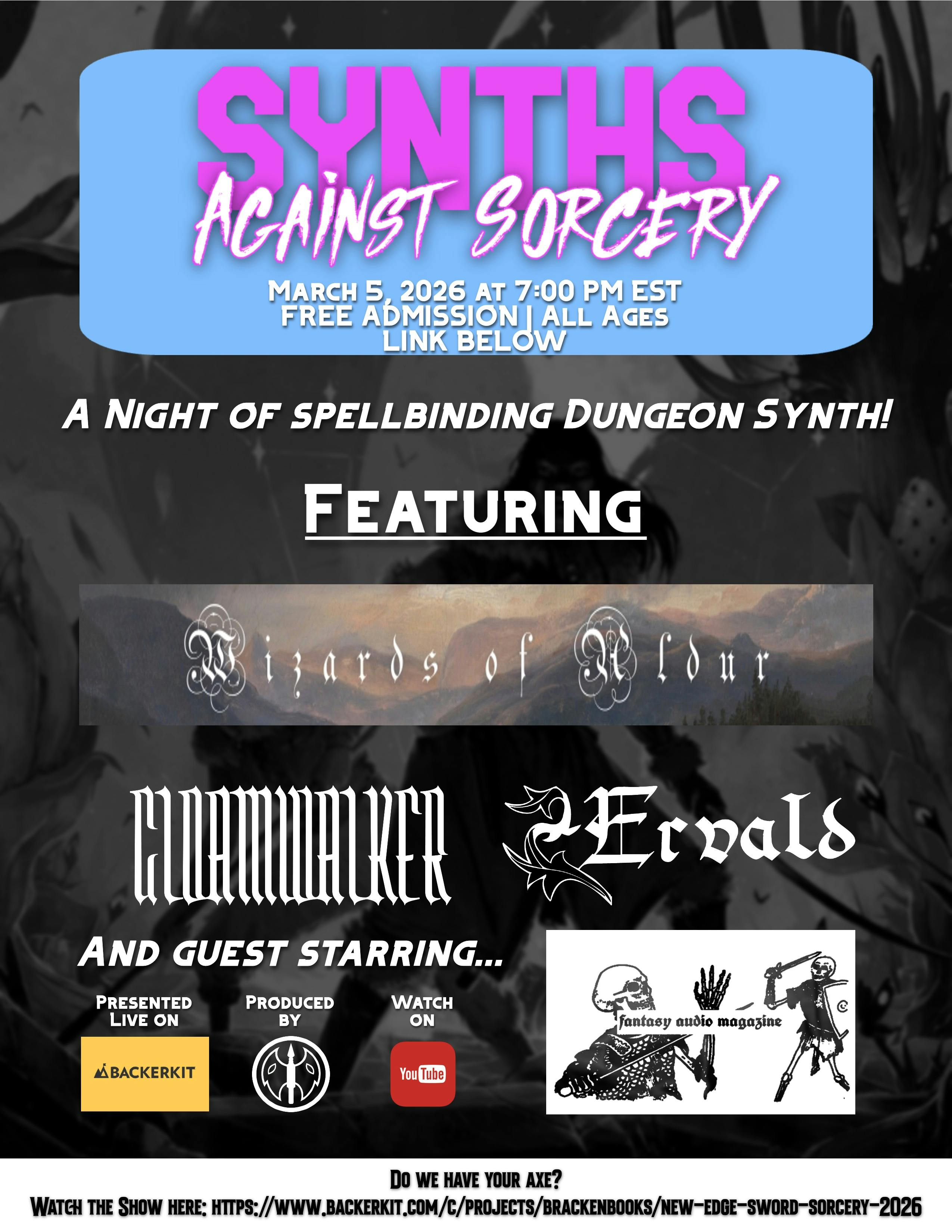 This is where you will see Pay Over Time mentioned in the pledging process. - Our next livestream is SYNTHS AGAINST SORCERY, a riotous good time centered on the very S&S genre of Dungeon Synth. It will including live music by and interviews with notable individuals in the scene. The stream begins at 7pm EST, this Thursday right at the top of the crowdfund page.
