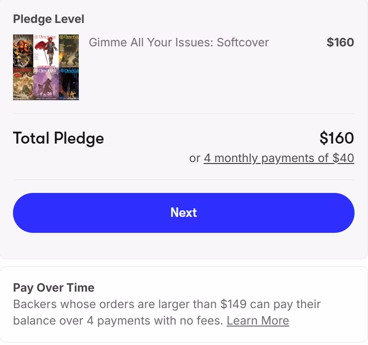 It is also possible to grab issue 1 as an Add-On. - "Pay Over Time" has been requested by some backers, and so we have activated it. Any pledge for $150 or more can now be paid for in four monthly installments with no interest or other complications.