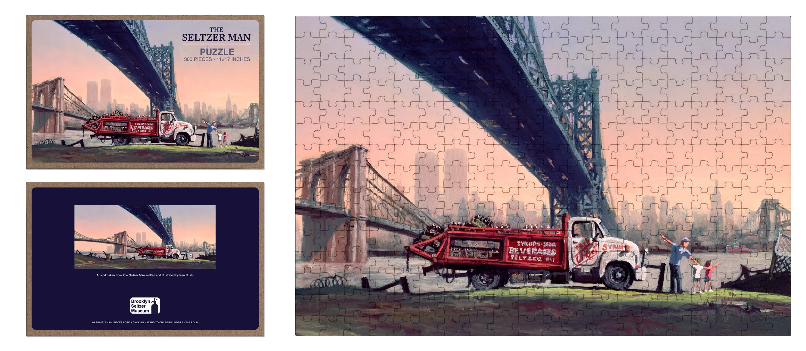 Each jigsaw comes in a box with a page from the book on the cover and, inside, 300 pieces that together create an 11X17 picture. Enjoy spending hours exploring the journeys through Brooklyn of the oldest seltzer man in America.