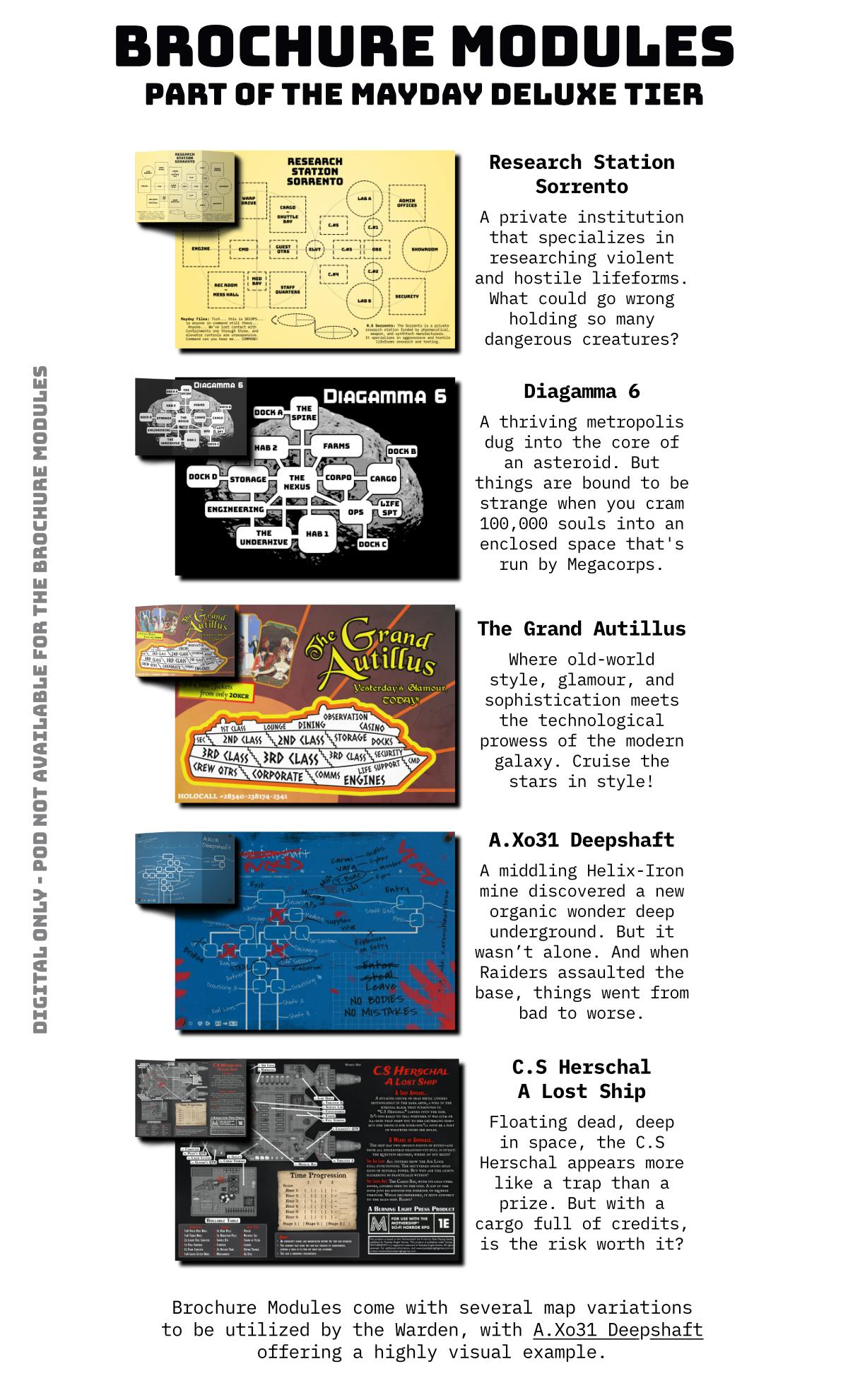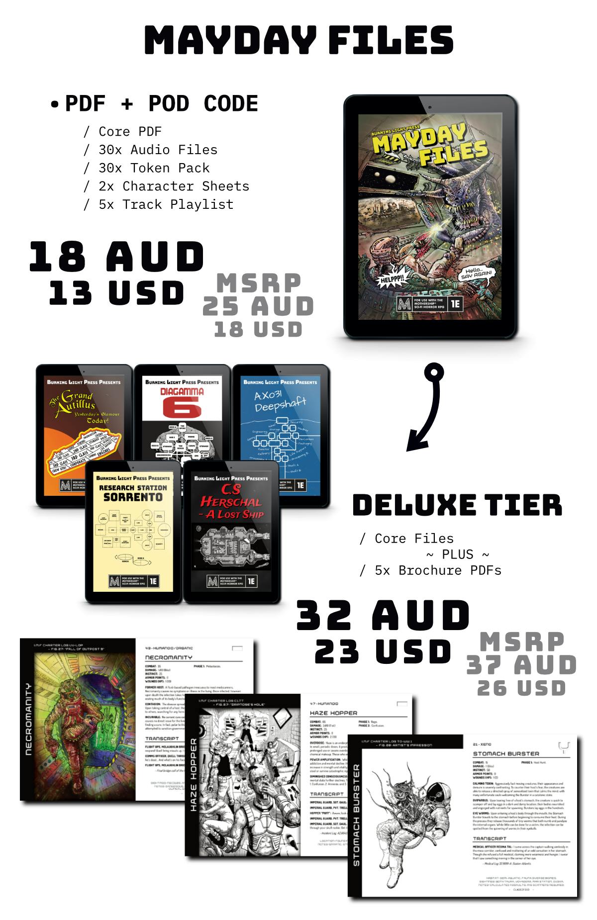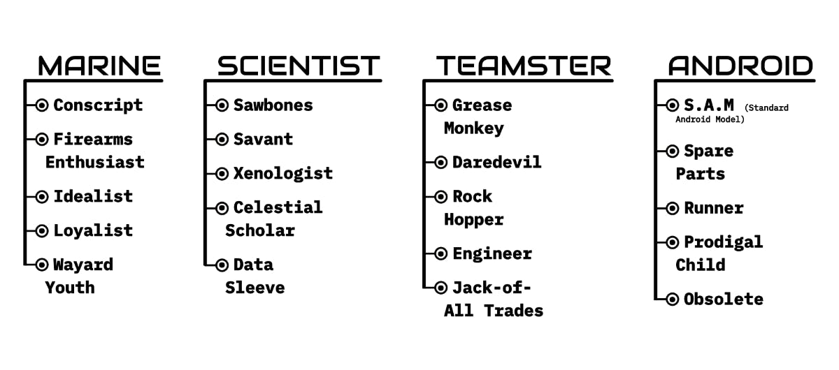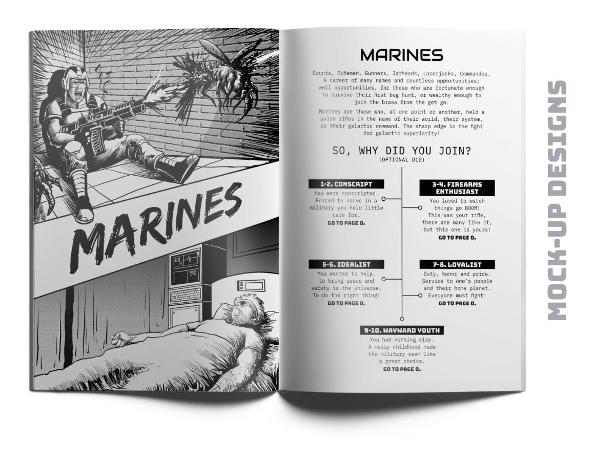 The supplement is designed to be easily implemented, with a path taken, an event chosen, dice rolled, and the results given. Perks or penalties depending on luck and fate. It covers the four Core Classes in Mothership: Marine, Scientist, Teamster, & Android, with five background archetypes provided for each.