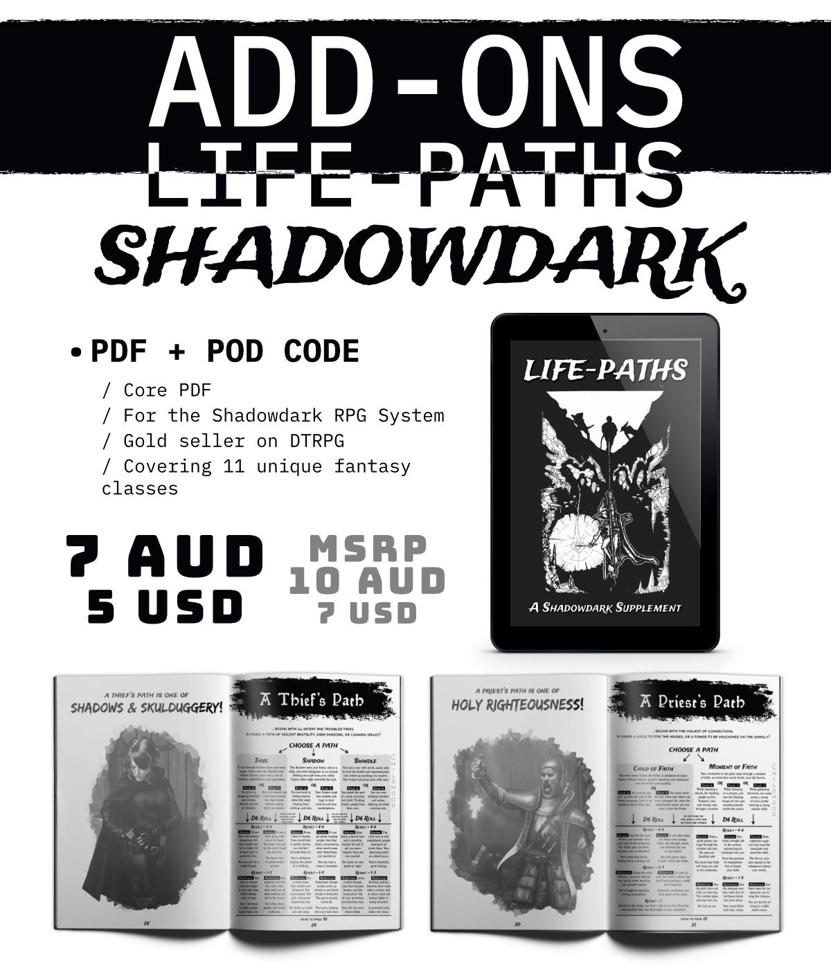 This product is a continuation of our Life-Path series, with the highly successful Shadowdark edition being incredibly well received (read the reviews for yourself). Check it out on DTRPG