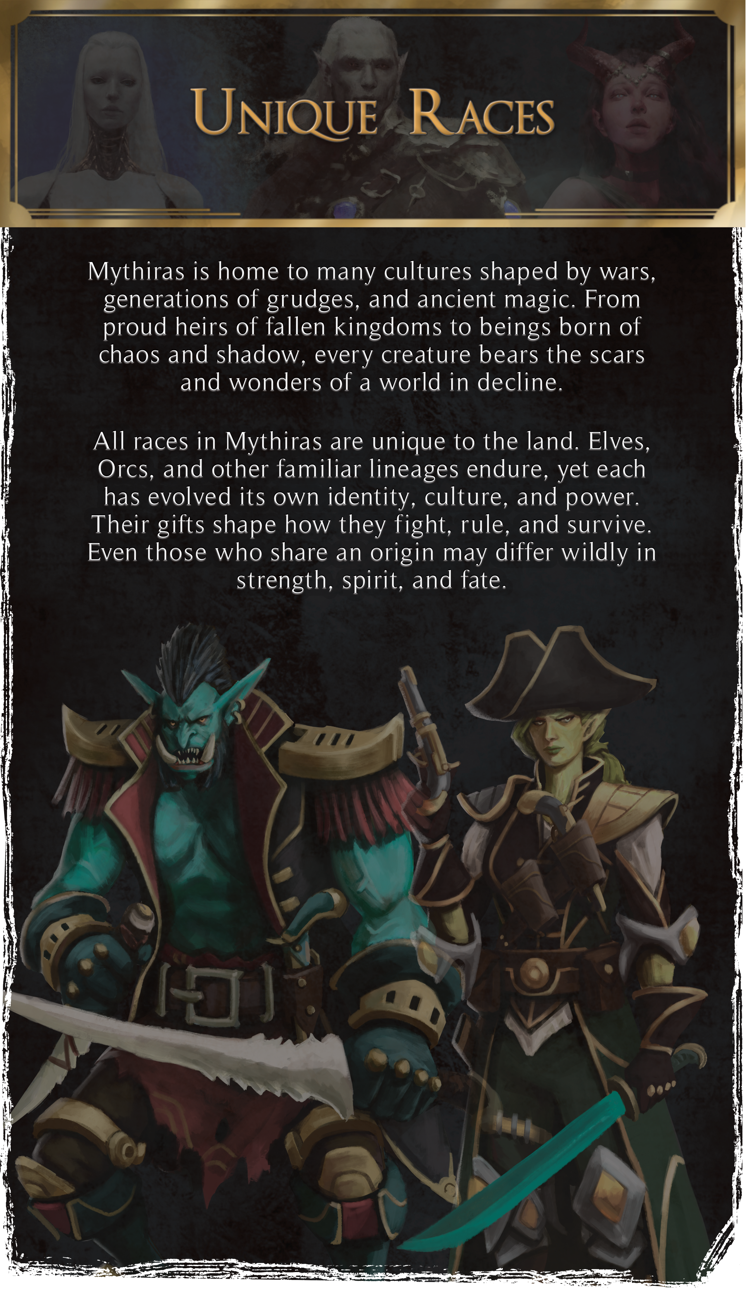 Mythiras is a realm where empires struggle, ancient forces awaken, and the Curse of Sorrow ravages the West. The world is designed to test your resolve, where every decision carries weight, and the line between good and evil is often blurry.