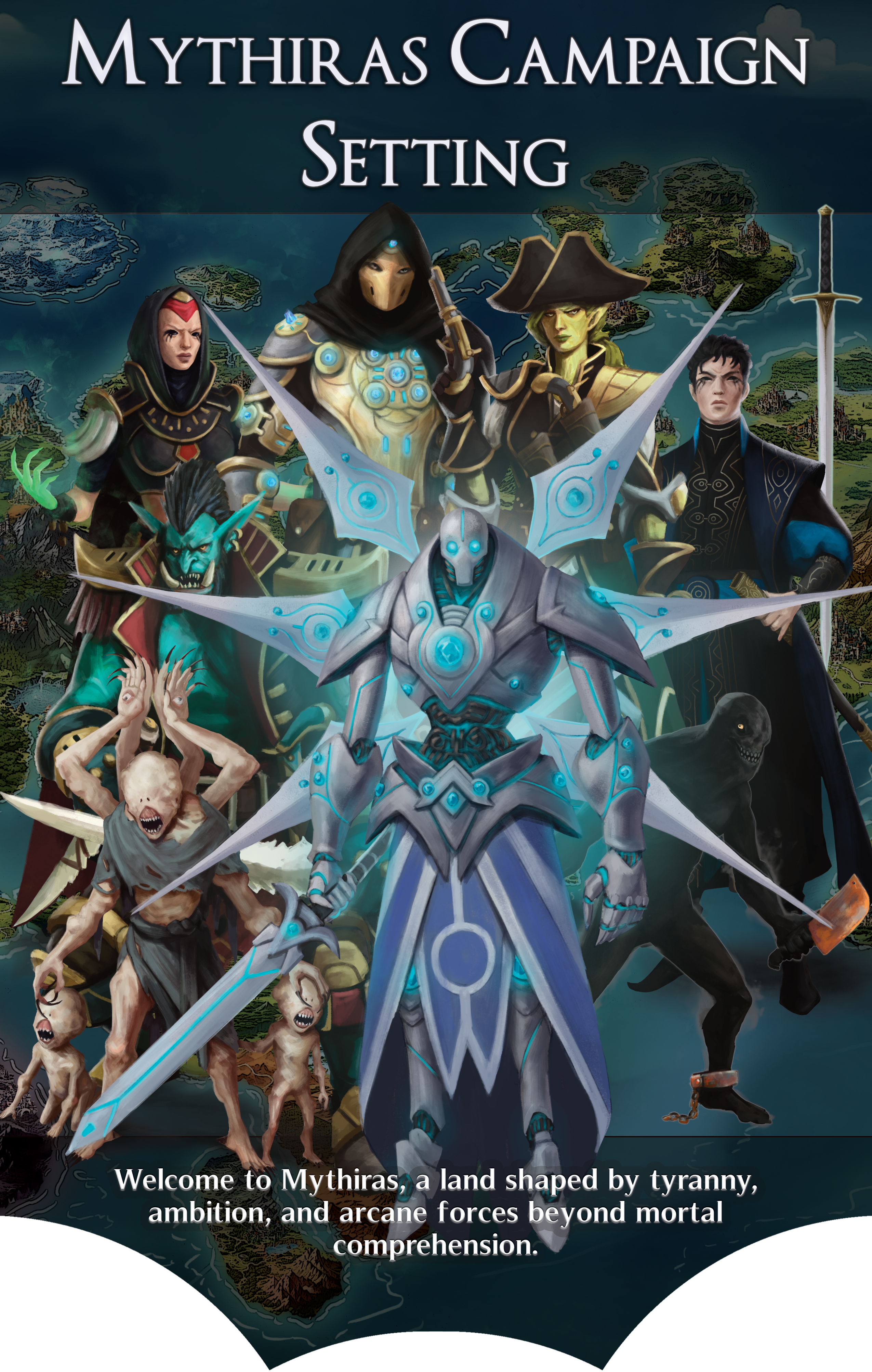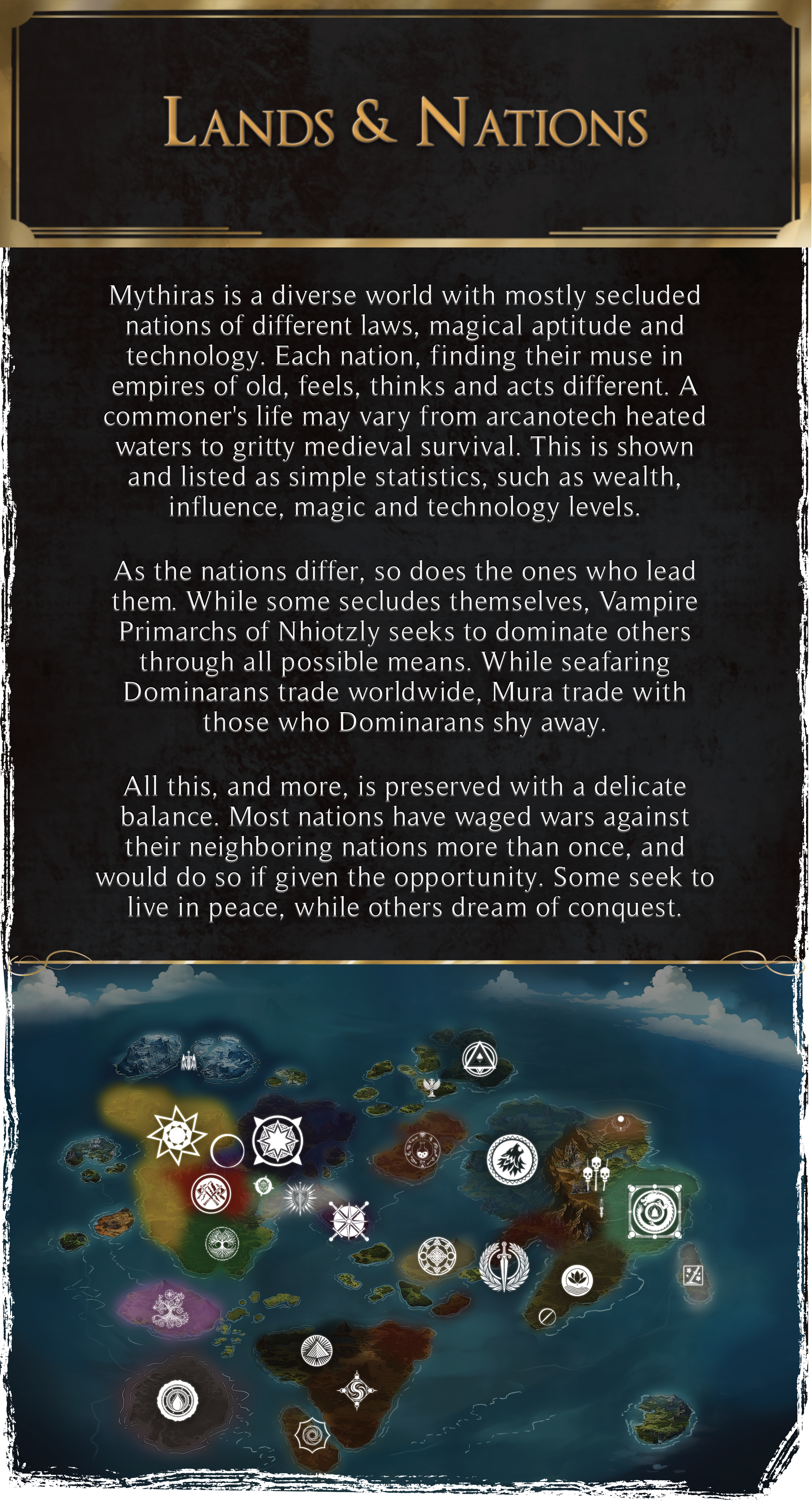 The four regions are defined by the cultures of the nations within: Sethra, Oshera, Assa, and the Dark Sea. Each nation has a different drive, values, technology, and strengths. Mythiras is a rich playground for brave adventurers, or a fancy grave. Brave adventurers will traverse enchanted forests, confront arcane terrors, and uncover long-lost secrets, all while resisting the crushing force of despair.