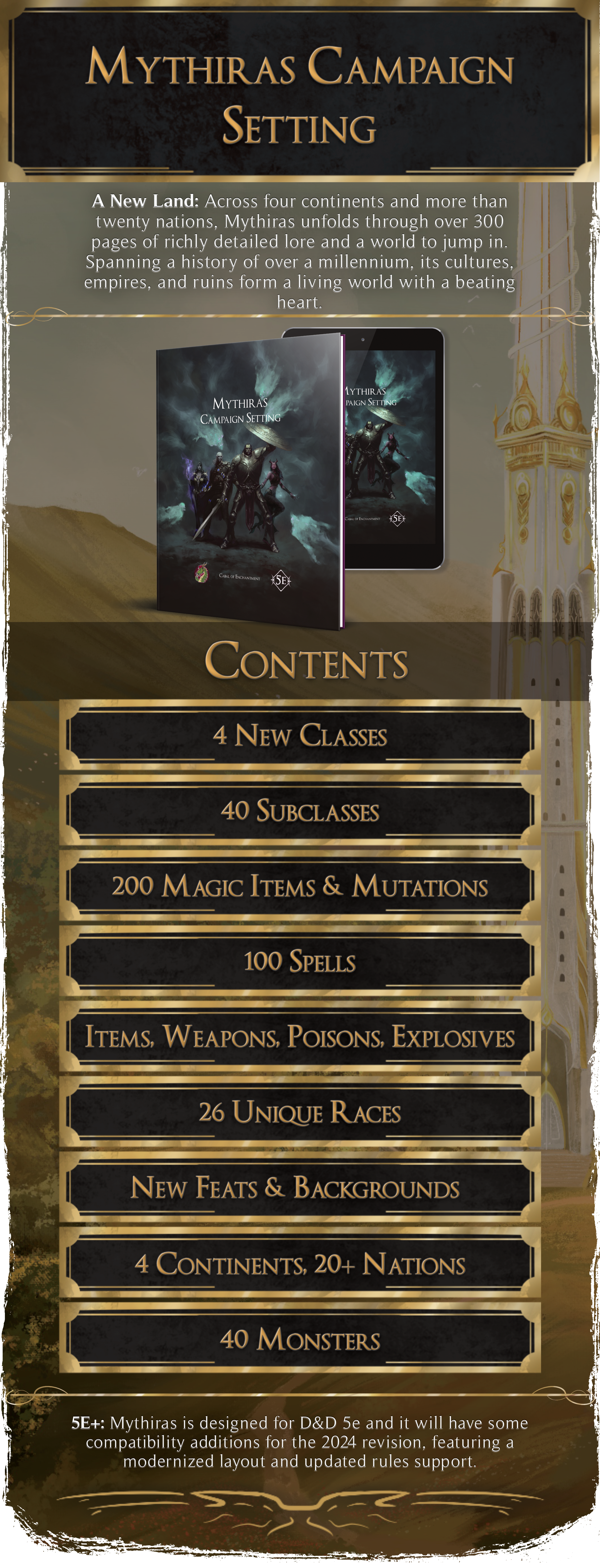 At Cabal of Enchantment, we're dedicated to crafting TTRPG content that enriches your gaming experience. Our latest project, the Mythiras Campaign Setting, is a passion project designed to take your 5e games to new, darker depths.