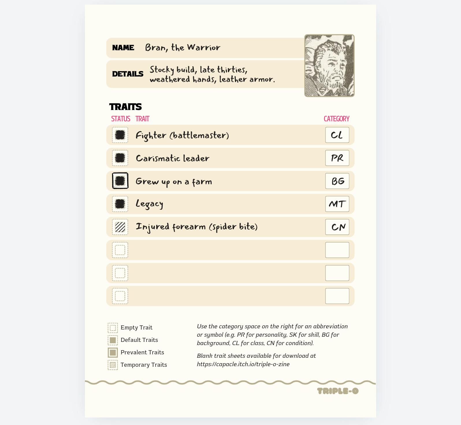 If you don’t recall, the Trait Sheet is one of the ways you can organize your character’s Traits when using Triple-O. You can absolutely play using the character sheets from your system of choice—just highlight keywords that might influence behavior and decisions—or even jot notes in a notebook. But the Trait Sheet offers a simple, structured way to track them separately, especially if you’re using Triple-O as a minimalist standalone tool.