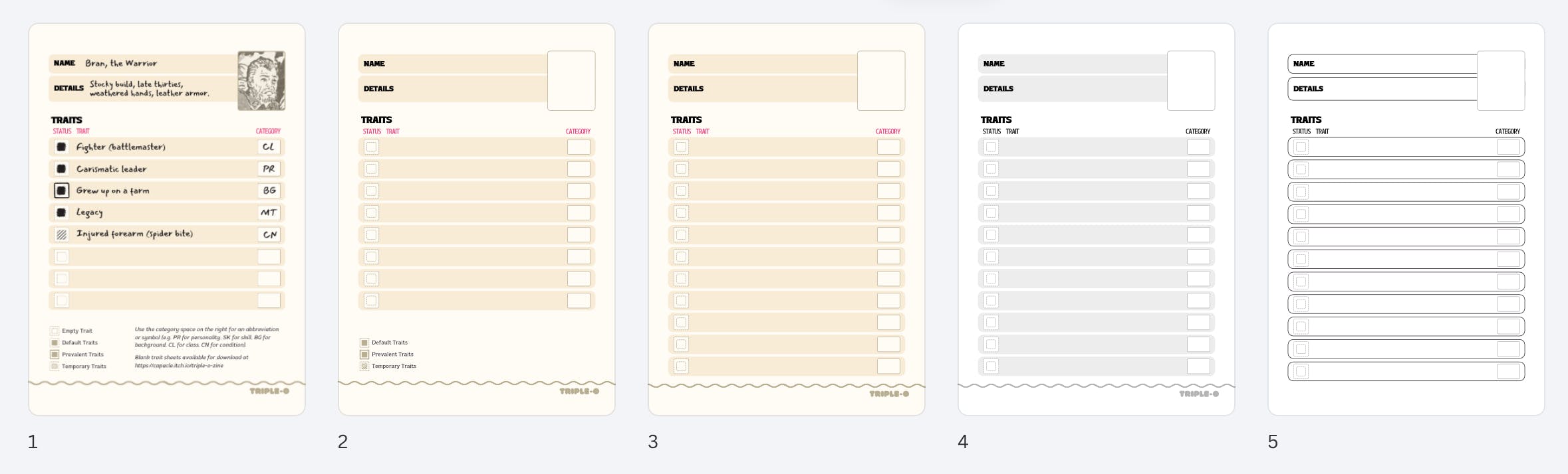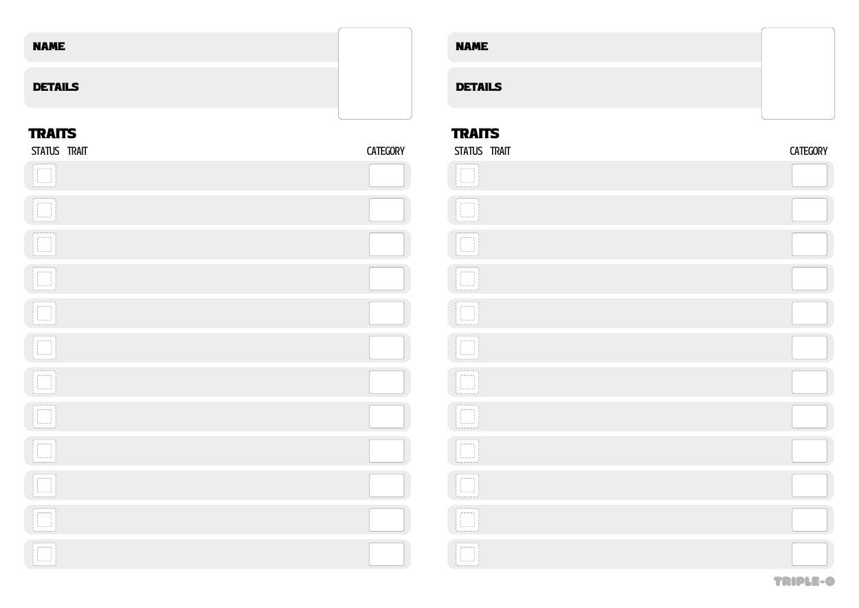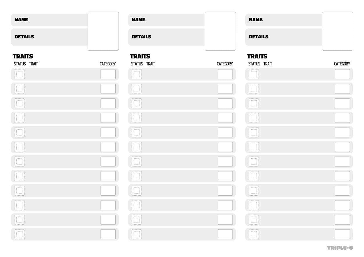 I’ve also designed several variations of the sheet with different levels of printer friendliness, plus A4 layouts with two or three Trait Sheets per page. That way, if you’re running a small party, you can keep all your characters on a single sheet.