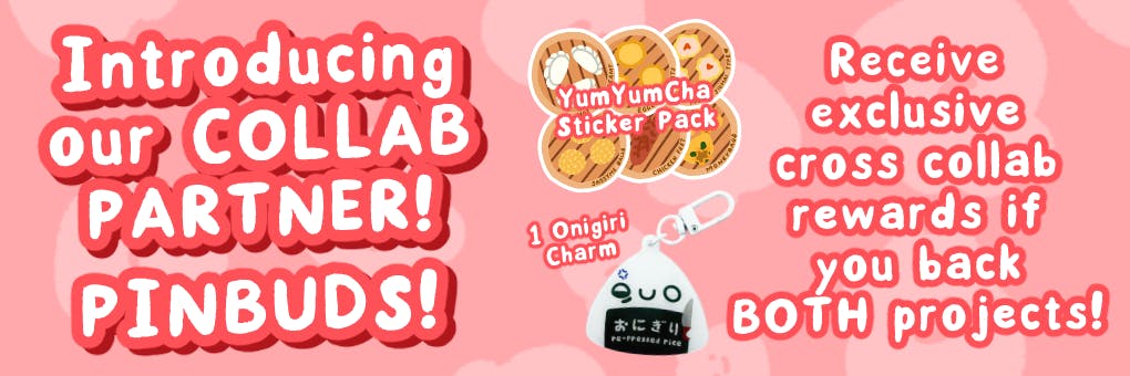 How cross collab works is that if you back both projects, you unlock FREEBIES from BOTH of these projects! So if you back both of our projects, you will receive an exclusive YumYumCha vinyl sticker pack from me and an adorable onigiri acrylic charm from Pinbuds!