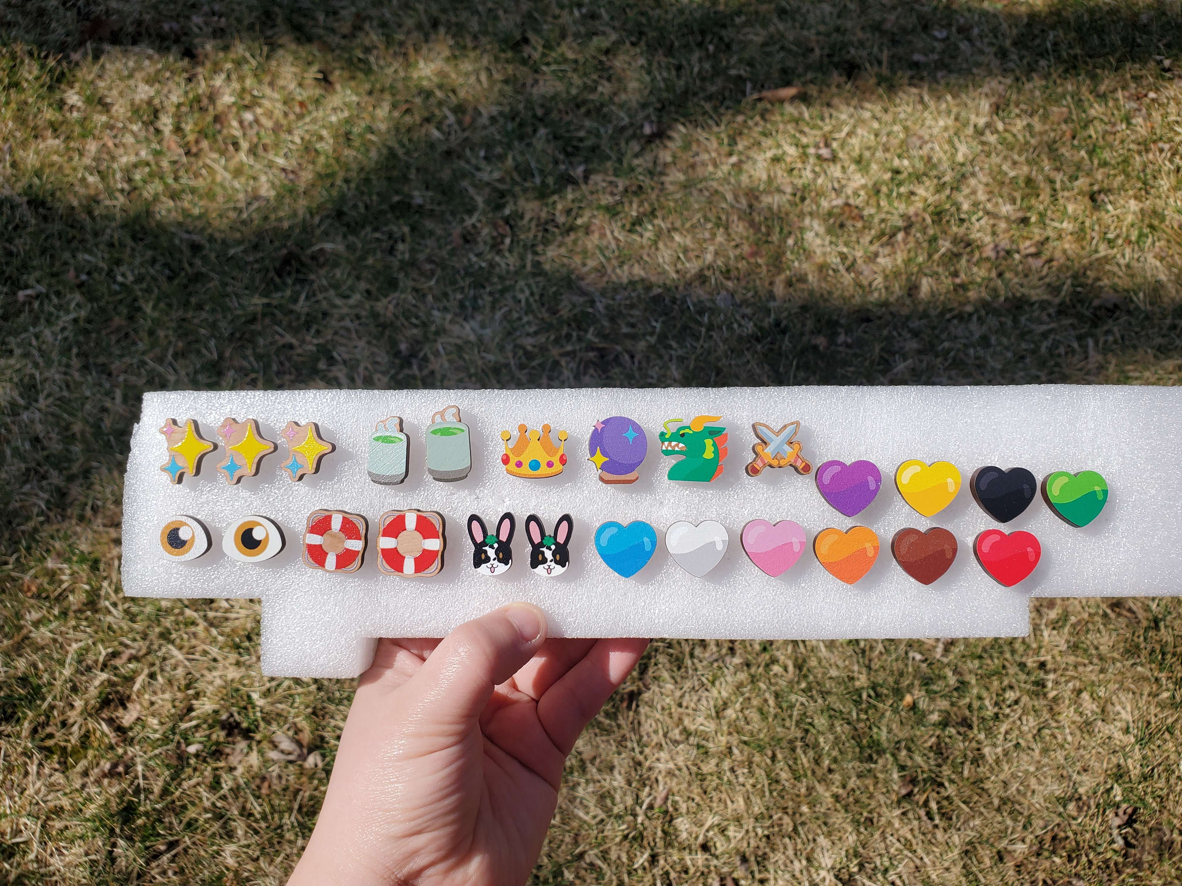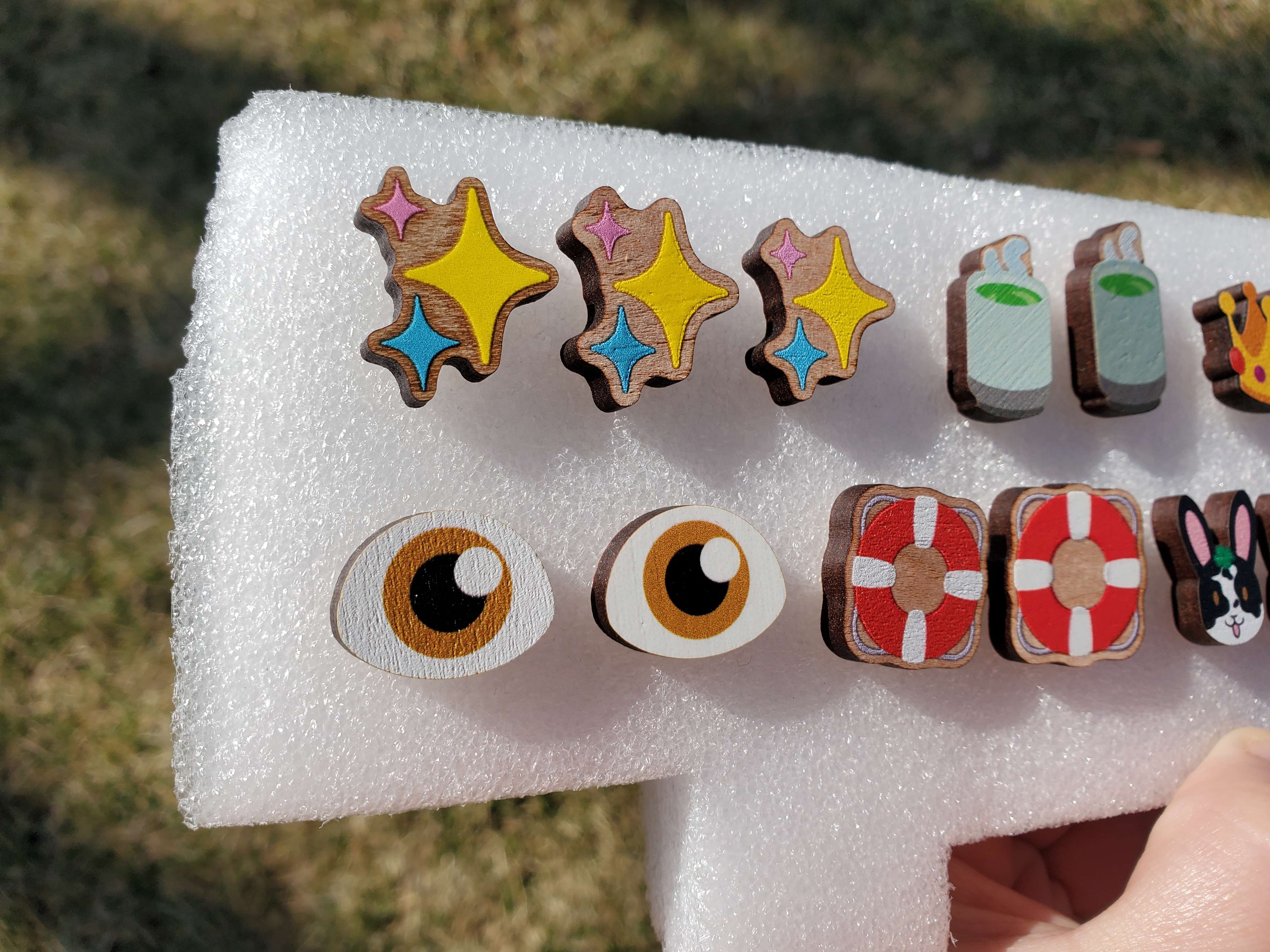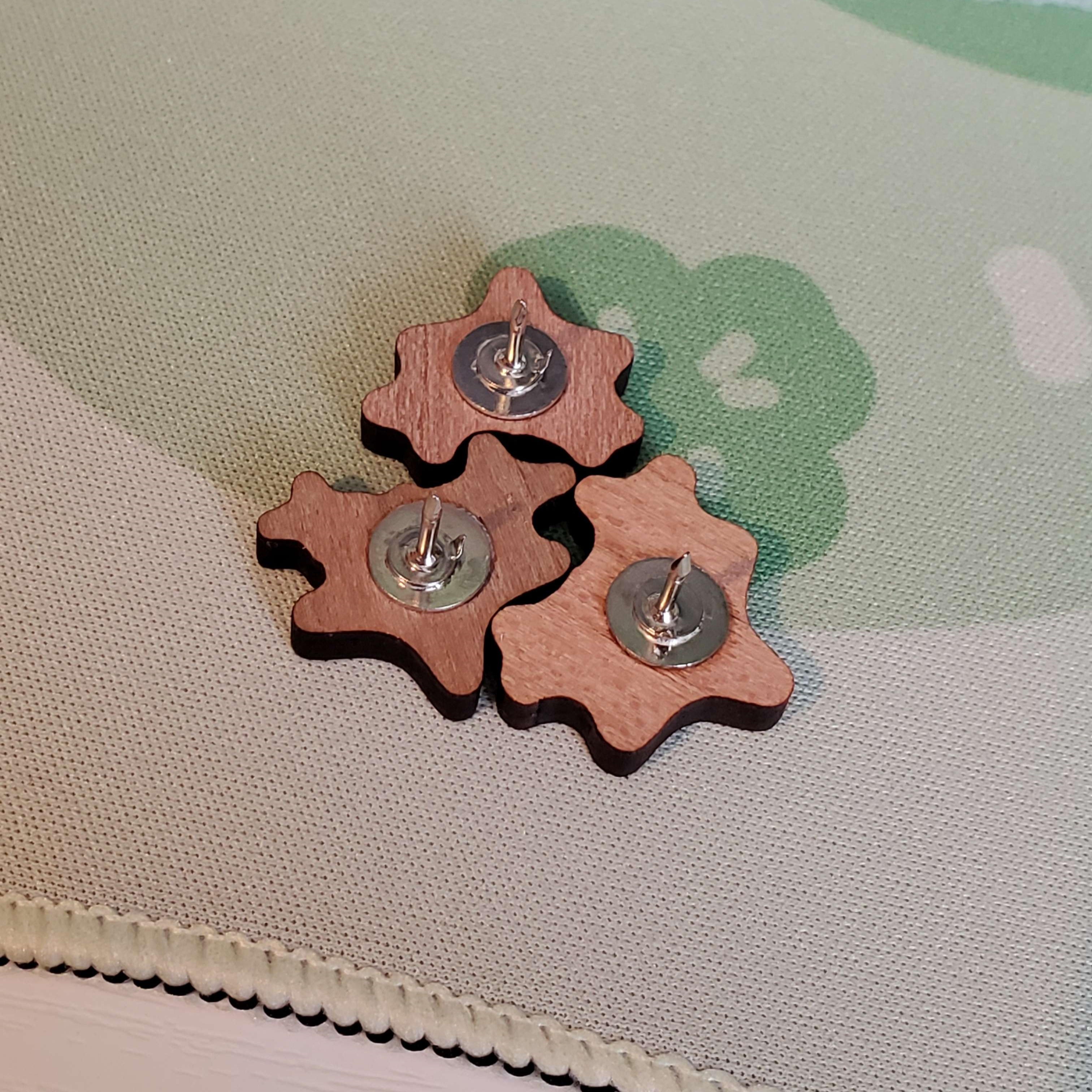 Other things to address: These pins are made of wood as you all know! Working with organic material means understanding the natural variants of it. You can see I ordered the Sparkle Pin a few separate times and the wood colors, while all the same cherry woods, do alter slightly from piece to piece. In addition to that some of the pins are smoother while others are rougher, this is also a natural part of working with wood. Personally I quite enjoy the natural differences, it brings a charm to the work :)