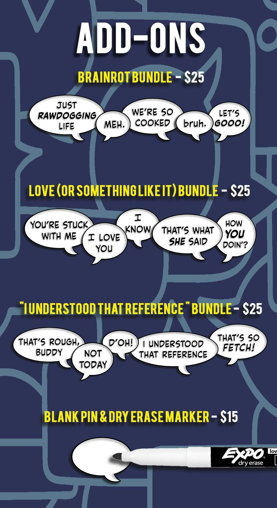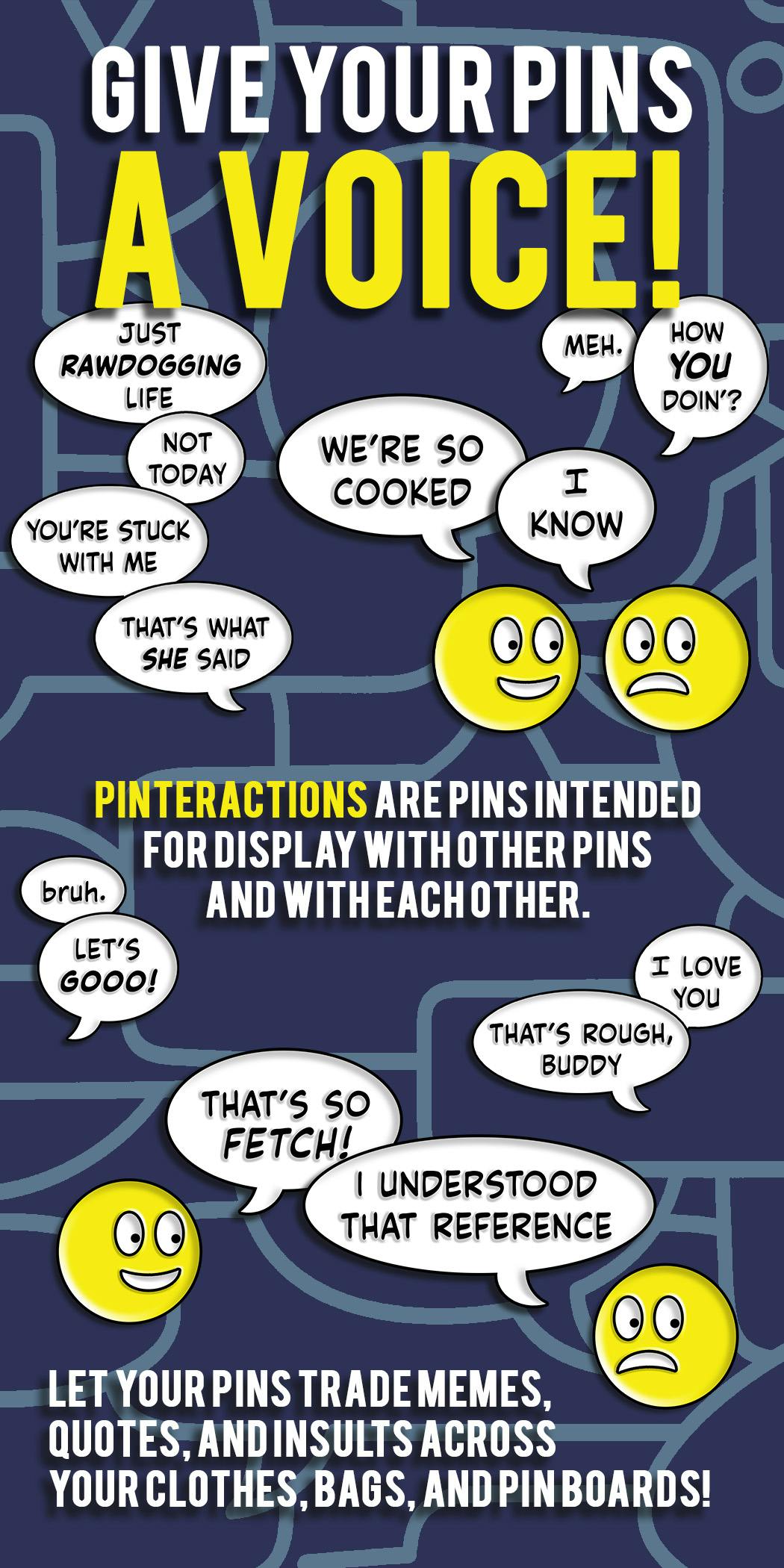 Quotes from pop culture, snappy trash talk, a few truly terrible pin puns, and simple conversation elements have all been selected to be open-ended and modular. The word balloons in this series from Clover Press are rendered in simple, clean designs so that they complement each other, as well as the other pins in your collection. You may have seen other word balloon pins, but PINteractions are uniquely intended for pairing and rearranging, similar to refrigerator poetry magnets. The phrases have been chosen as much for versatility as for familiarity.