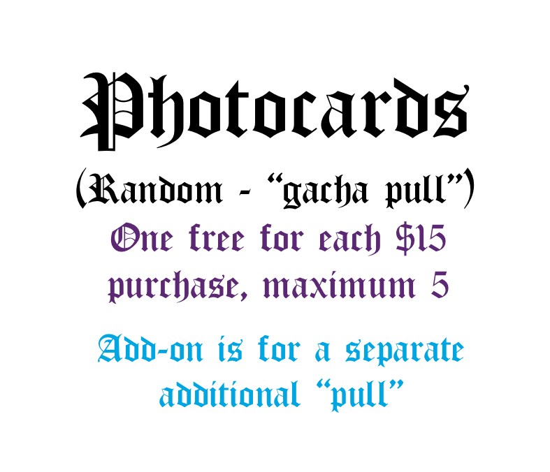 In addition to the designs there will also be add-on options of stickers, Photocard holders, and more attempts at the "gacha" photocards, which will be listed further down the page! These items will only be available in this campaign as of right now, so any excess is all that will be purchasable after the campaign ends. So if you're hoping you can snag anything afterwards, there is no guarantee it will be in stock in my shop.