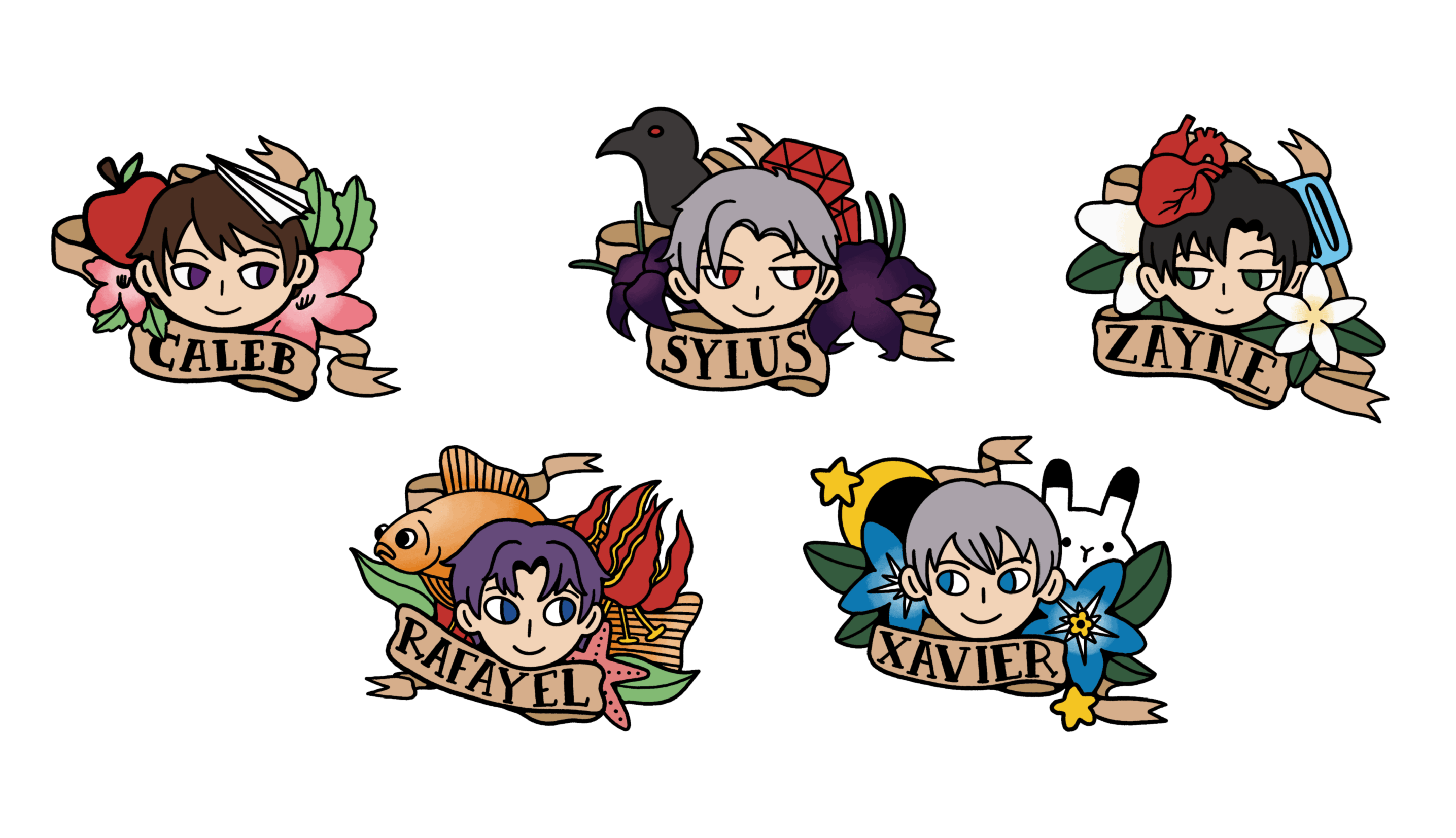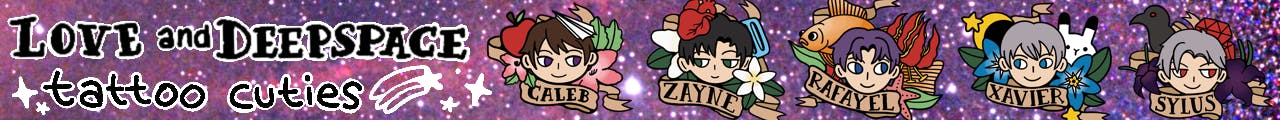 Crane Game Cuties is a Love and Deepspace enamel pin set inspired by traditional tattoos and will be 2.5”. There will be UV printing to achieve the gradients and provide extra detail on the flowers (and fish!). The goal will allow the production of each of the five current LI’s in this tattoo inspired style.