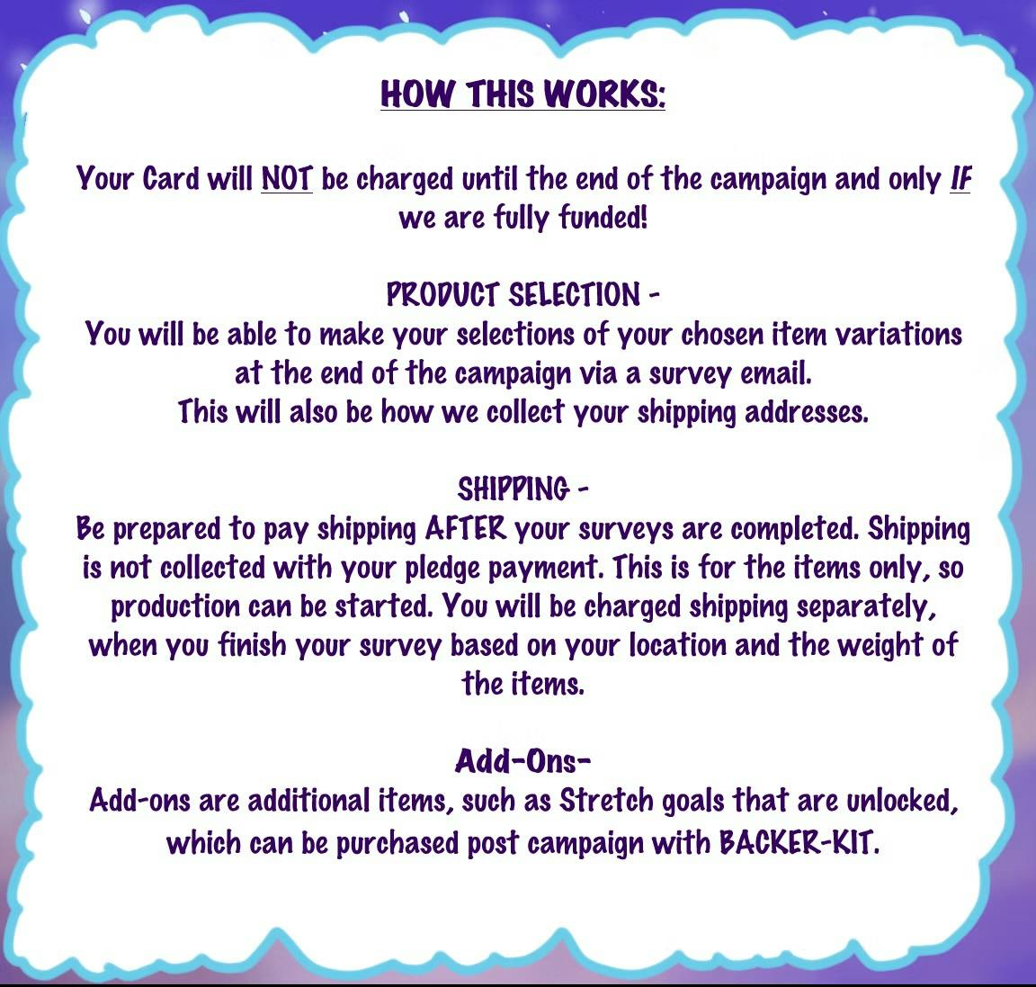 For Add-ons with multiple variations, such as pins, plush, keychains etc., you will be able to select your choices via your survey after the end of campaign, along with your choices for your pledge tiers!