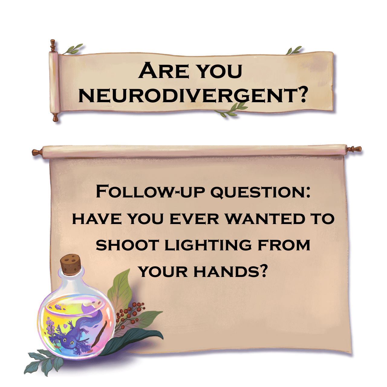 Accepting a neurodivergent label can be a terrifying thing. We have one school of thought that says "your life is over", and we have another that says "this is a superpower" - neither develop healthy neurodivergent people. In this game, we use neurotypes as a substitue for class types, letting people pilot a character not too disimilar from themselves to understand what the challeneges and strengths are for each neurotype.