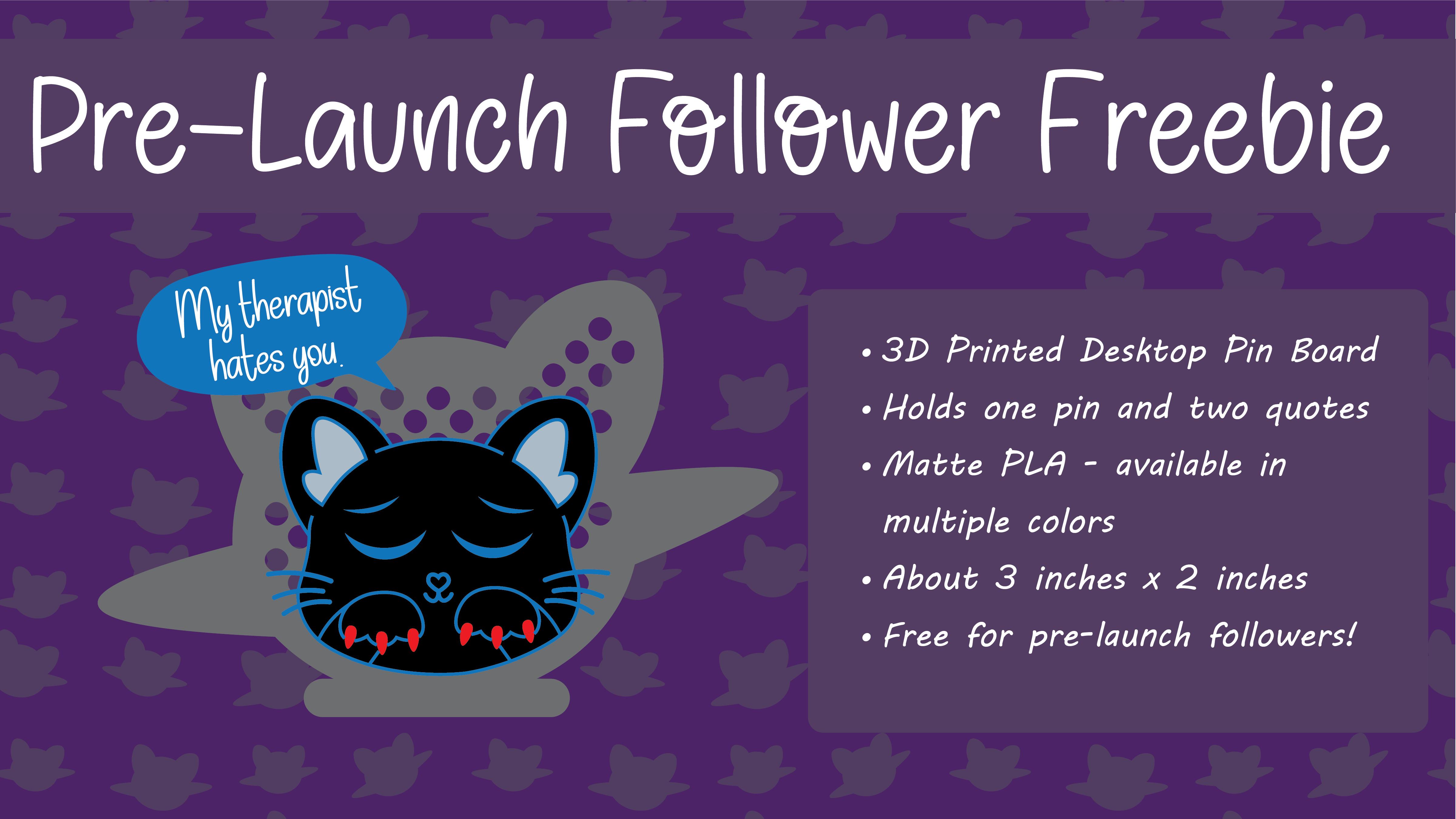 Besides our traditional returning backer and early bird backer freebies, we have a new incentive. If you've followed the project and back while live you qualify for a custom designed 3D printed pin board. This is a small desktop pin board to hold one pin and two quotes.
