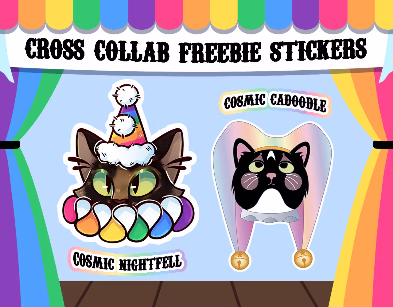 When you back both my campaign and Pridetones by Cosmic Cadoodle, you'll receive a free sticker from the both of us featuring our cats as clowns! Backer these two campaigns puts you 2/3rds of the way to getting the banner freebie as well.