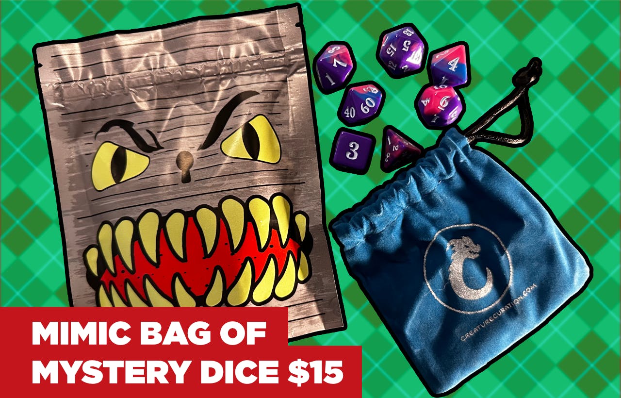 People love a surprise! Inside this resealable Mimic bag is a full set of random polyhedral dice, tucked in a drawstring bag. It's the present that you get to keep opening up!