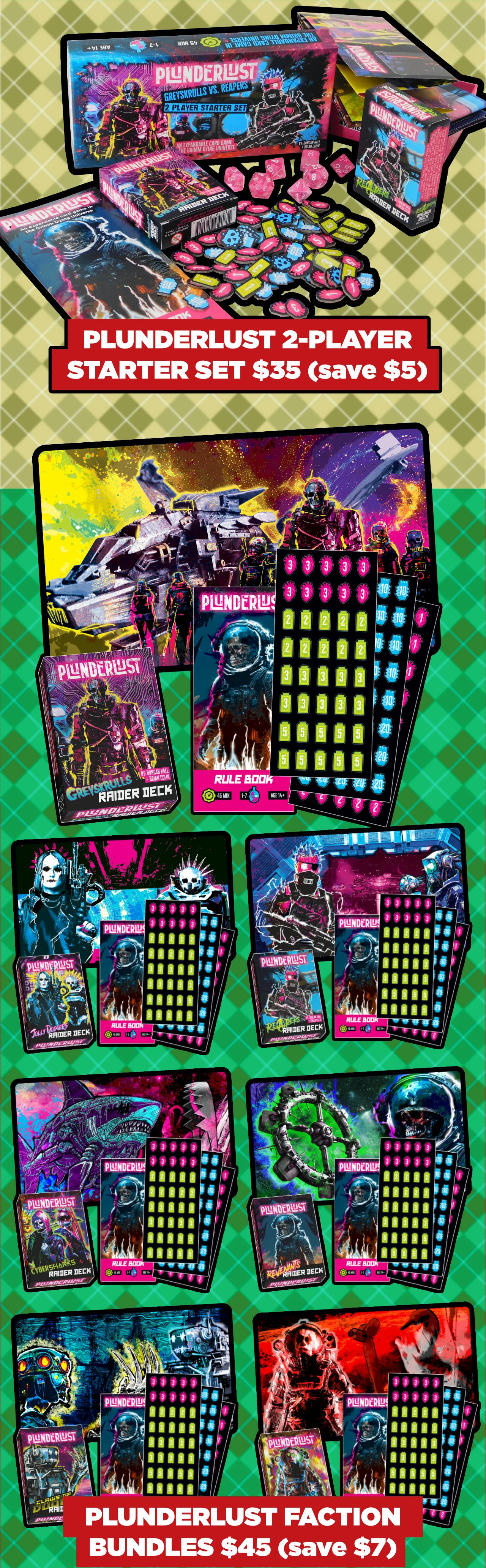 Plunderlust is an expandable card game where you build a crew of space pirates, explore locations, and fight monsters. Along the way you'll earn credits to hire a strong enough crew to defeat a boss monster.
