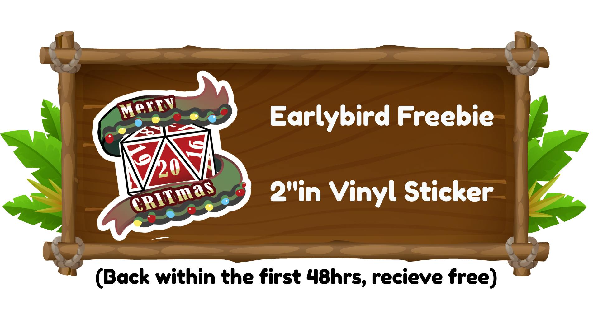 For the lovely early birdies, we have a "Merry Critmas" 2in D20 freebie sticker included with pledges made within the first 48hrs of the event.