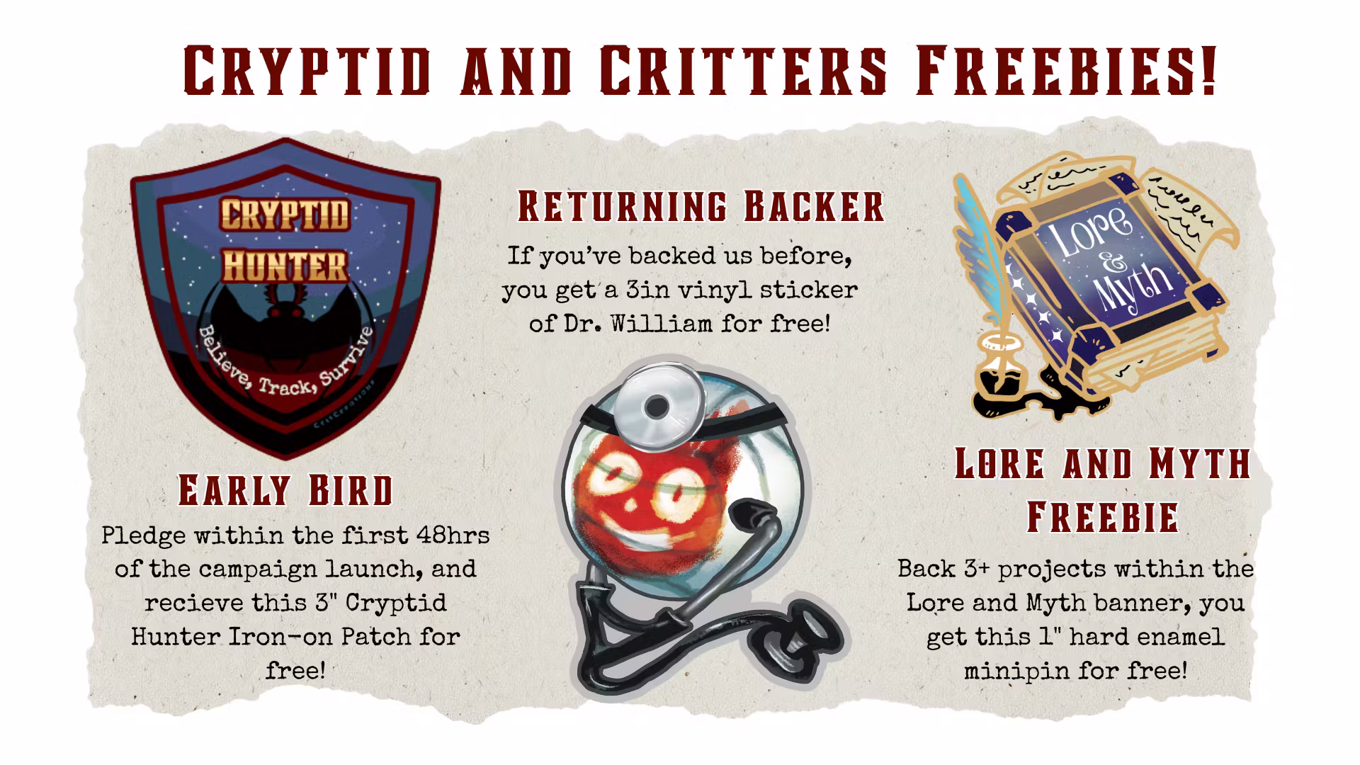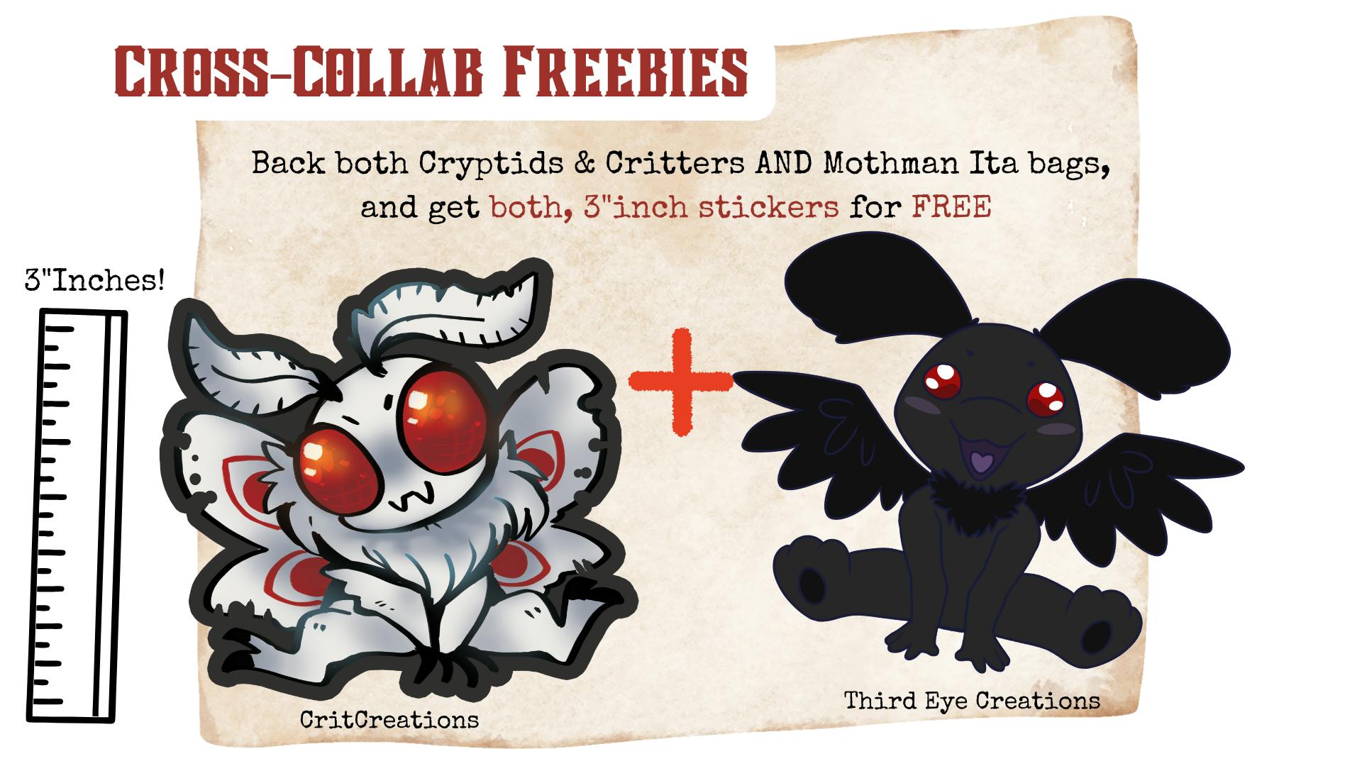 Partnering with Mothman Ita bags for this event, if you back BOTH of these projects, you get BOTH of these 3in stickers for FREE!We thought it would be a perfect pair for our Cryptid pin project- and that you guys might like them too.