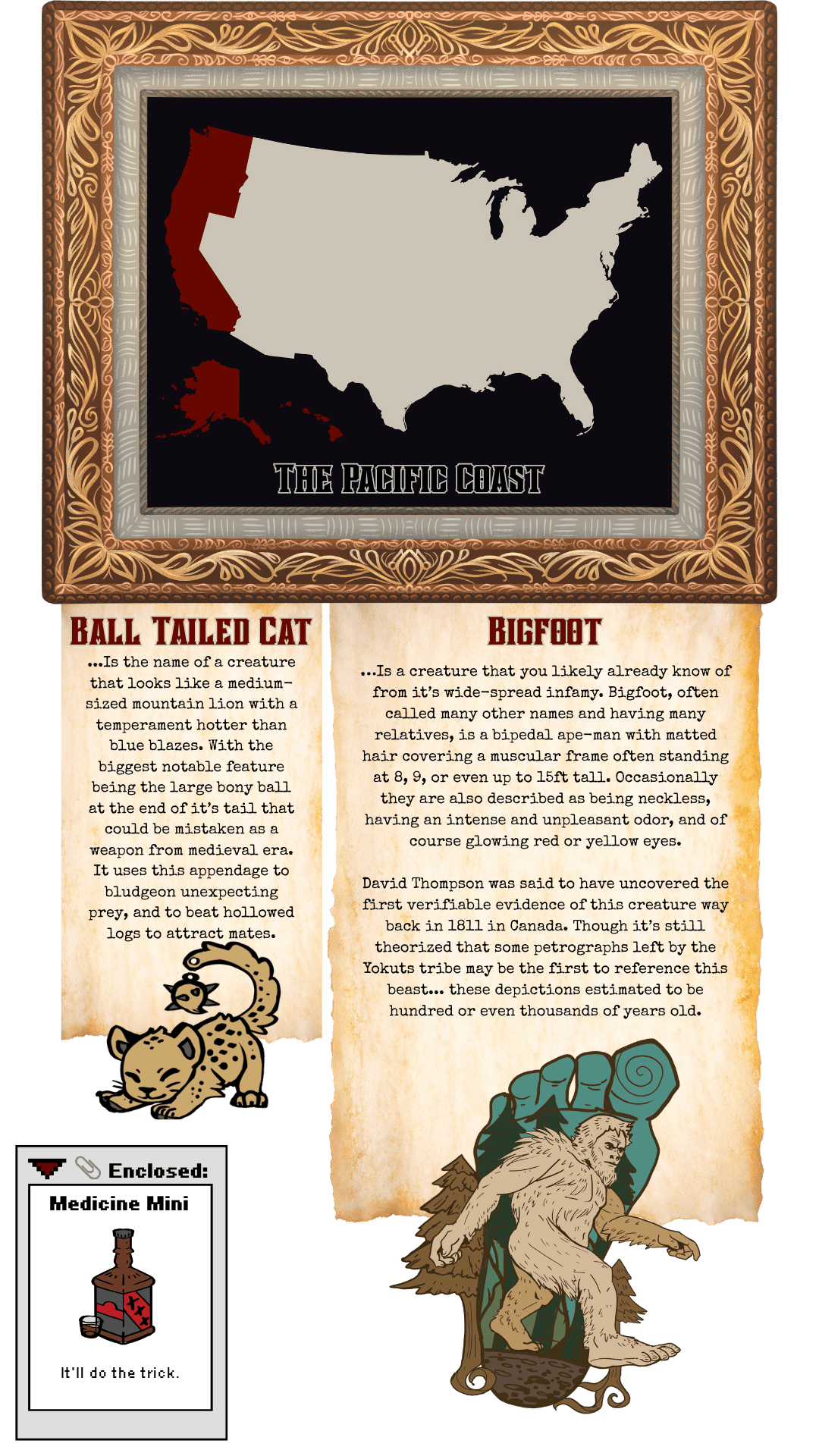 An Enamel pin collection of large 3d, standard, and mini pins of Cryptids, and Fearsome Critters-a group of legendary creatures in the folklore and traditions of lumberjacks during the 19th and early 20th centuries in North America.