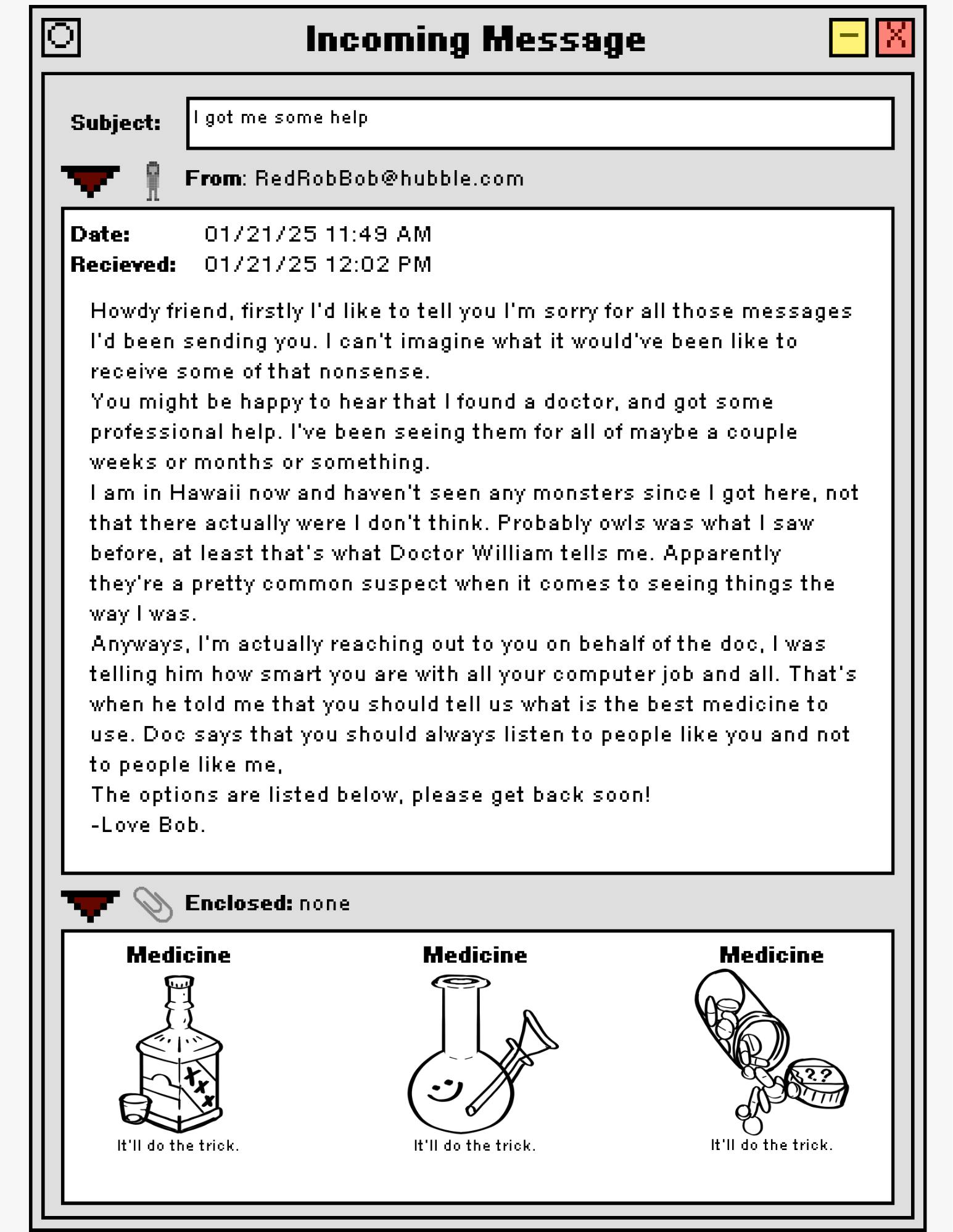 Thankfully Robert seems to have finally gotten rest away from the nightmares of his weary mind - relaxing in Hawaii no less! It seems that with the doctor's help he has finally come to his senses after a lengthy 32 years of running. Nevertheless, Mr. Mitchell is grateful for your guidance along his journey, and would ask of you one last opinion; What kind of medicine do you think would best soothe what ails him?