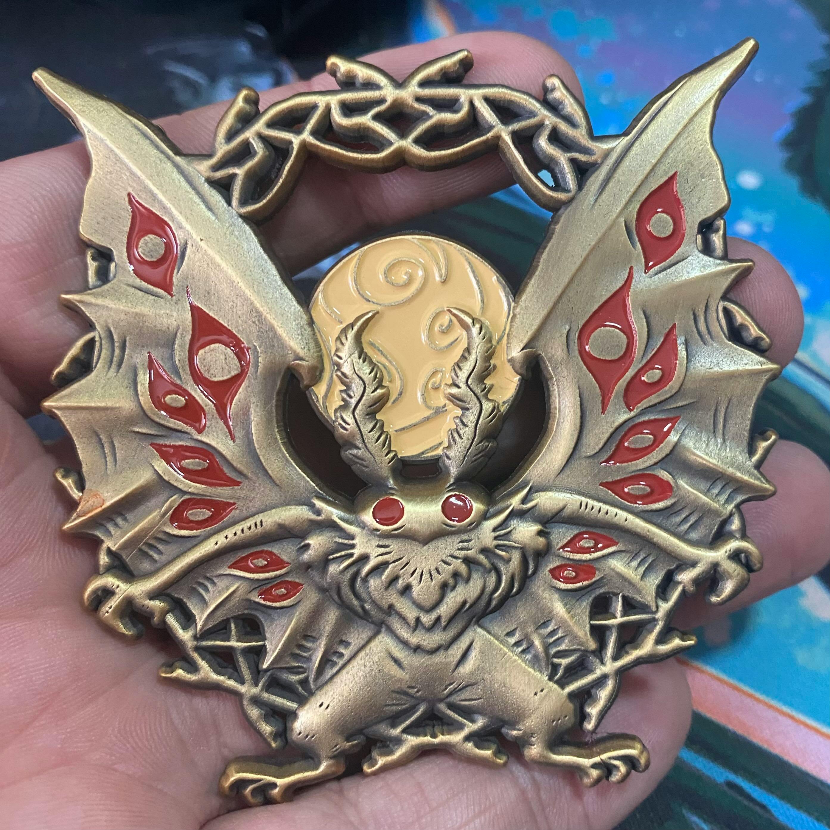 NOTE: While it is not the case for this Mothman, we had a suggestion from one of our backers (special thanks to Rhiannon!) to make the moon glow on this design. We asked our manufacturer if we could make that change for the rest of the Mothmen when we order them, and they agreed! Mothman will now have some glowing moonlight to guide his flights in the dark :>