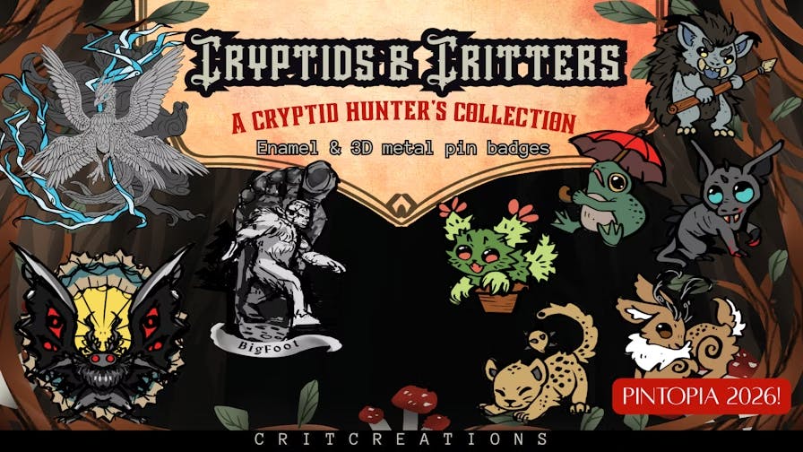In this campaign we'll be featuring the infamous North American legends reimagined in a form of hardened enamel! We're planning to have three different variants of pin sizes; Our largest designs being 3D molds at a size of 2.5 inches that feature some of the most fearsome creatures from American mythology like Bigfoot and Mothman, Our medium designs being basic hard enamel pins at a size of ~1.5 inches that feature the cuter critters from tall tales like the Jackelope and Cactus Cat, and finally our smallest designs at 1 inch or smaller that will feature all the important items that a cryptid enthusiast's might need in their tool bag. We have big plans for this upcoming project, and we're super excited to invite you into our creative process!