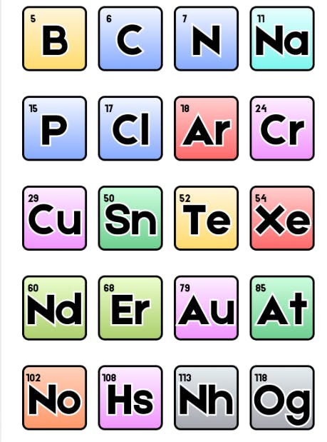 (A helpful list; Ar, At, Au, B, C, Cl, Cr, Cu, Er, Hs, N, Na, Nd, Nh, No, Og, P, Sn, Te, Xe).
