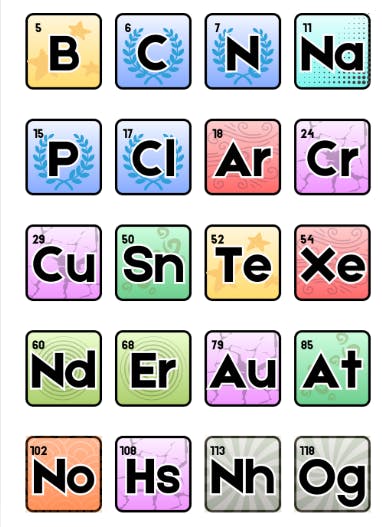The elements featured are; Argon, Astatine, Boron, Carbon, Chlorine, Chromium, Copper, Erbium, Gold, Hassium, Neodymium, Nihonium, Nitrogen, Nobelium, Oganesson, Phosphorus, Sodium, Tellurium, Tin, and Xenon :>