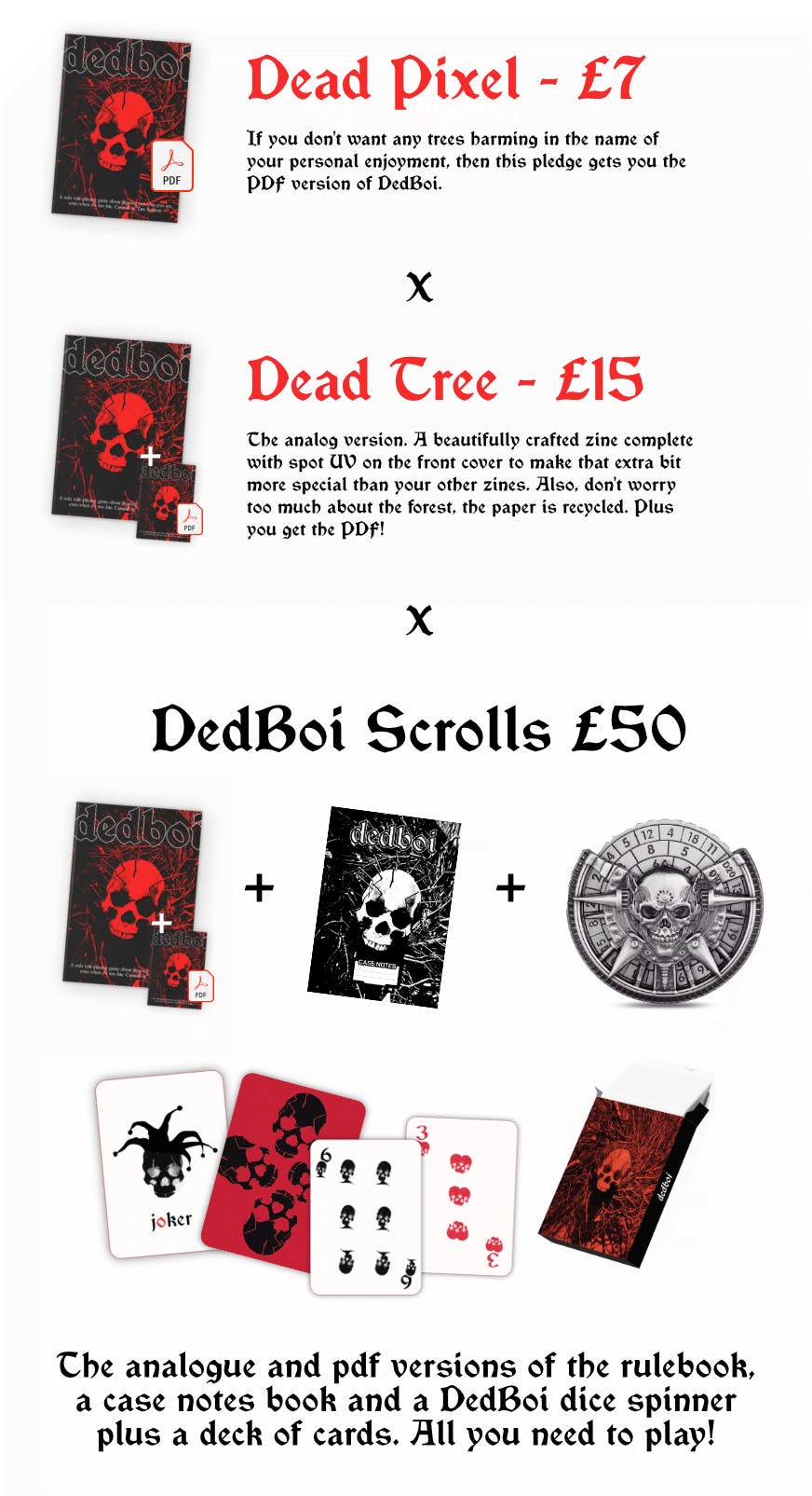 Genre Bending. The prompts in DeadBoi are designed to spark your creativity and guide you in your investigations. However, they have also been designed to be setting-agnostic, meaning you can play DedBoi in any world you wish. Fancy figuring out how you ended up in an ancient Mesopotamian ziggurat? You do you! Or how about New York City in the 1970s? Or even a generation ship heading for Alpha Centauri! You get it.