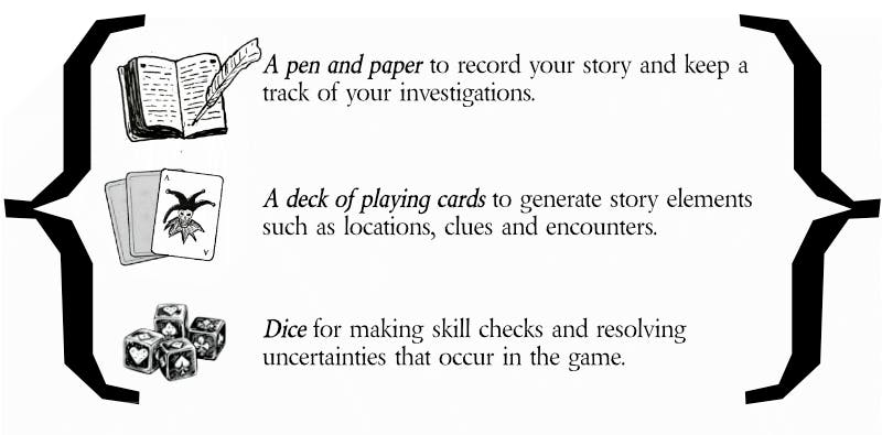 Your story unfolds as you visit a dozen locations, look for clues, and piece together what you learn to build a theory of who you are and why you died. Dice and playing cards drive the events and encounters you have, but all other choices are yours. You might be dead, but you still have agency! Things you will need to play DeadBoi: