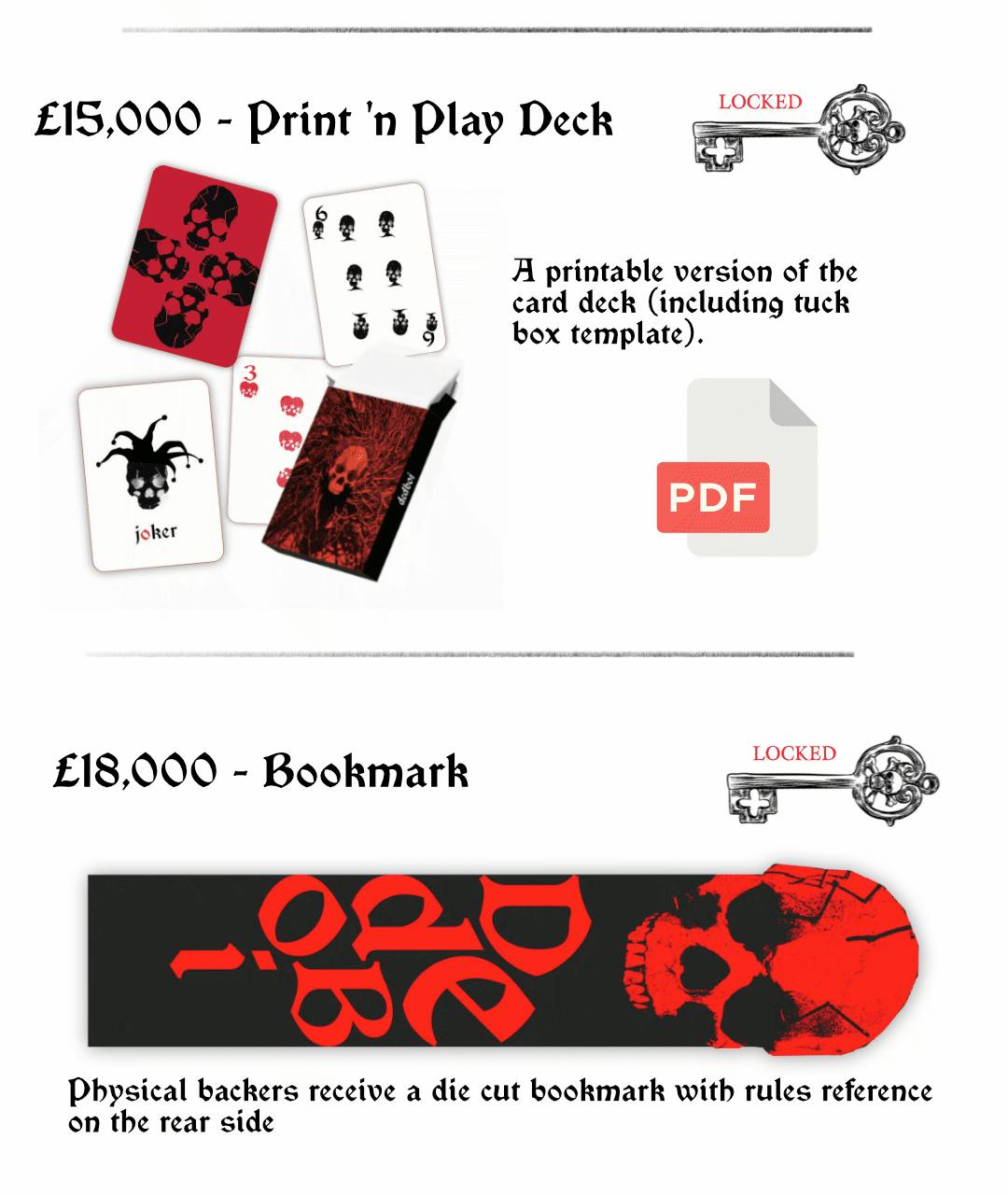 At 18k, we will add a physical bookmark for physical backers and a pdf printable one for digital backers. The bookmark will be die-cut with a DedBoi design on one side and a quick rules reference on the back!