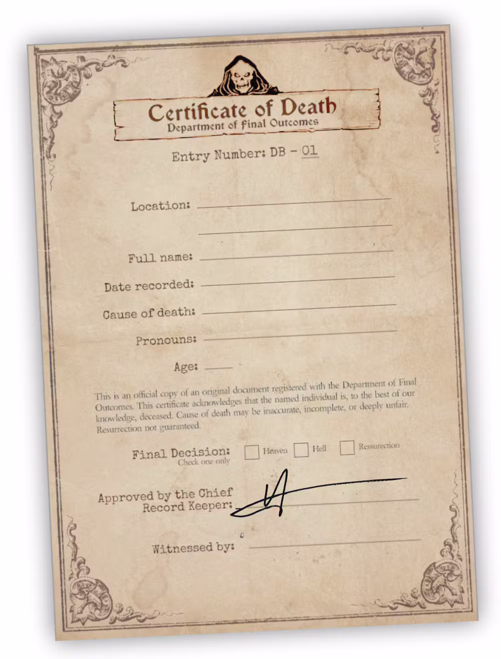 Each cert is signed and numbered (physical copies are handsigned) and also can be used as a part of the game and kept with your case notes and character sheet!