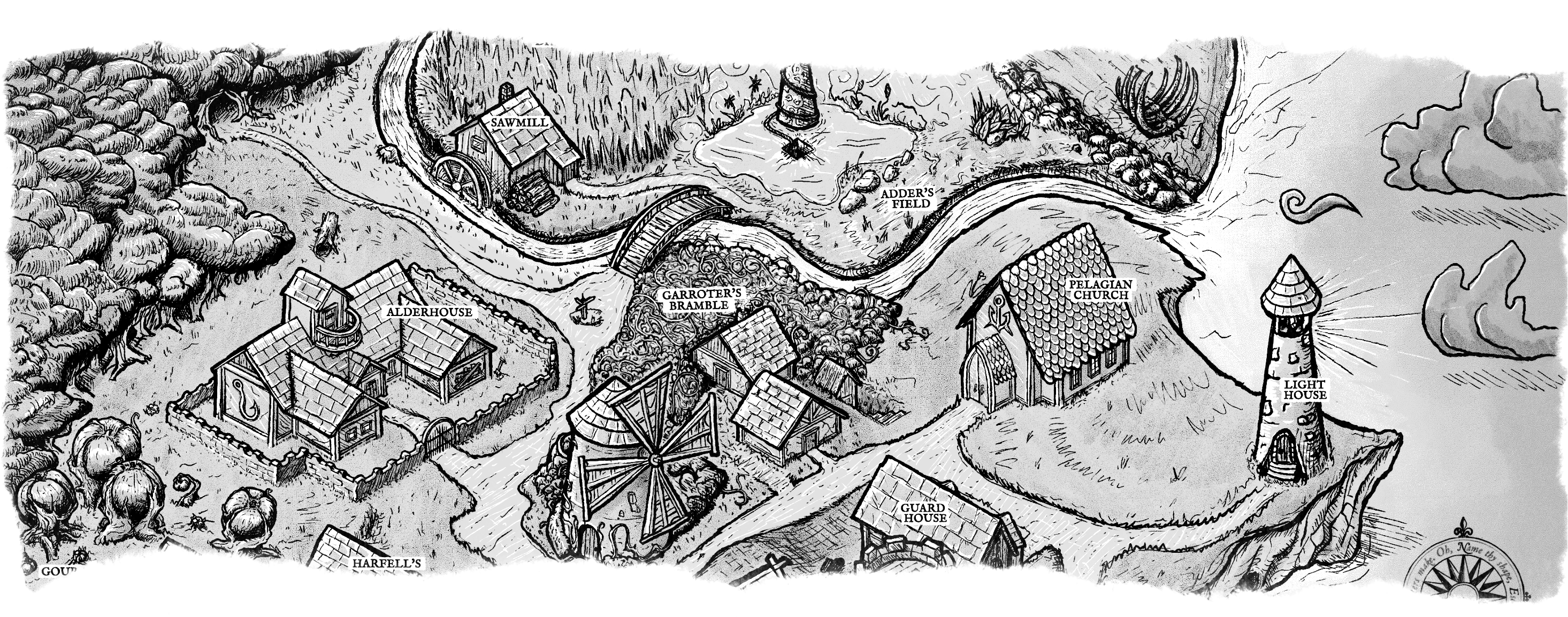 Here's a sneak peak at the physical edition tri-folds for At Wick's End and Skreave's Hook! Note: Skreave's Hook will come with two pamphlets: one for the player-facing map and another for the adventure itself. The Inchoate Garden will be the same format as the Skreave's Hook adventure.