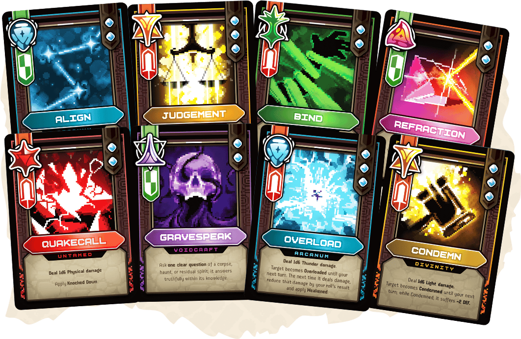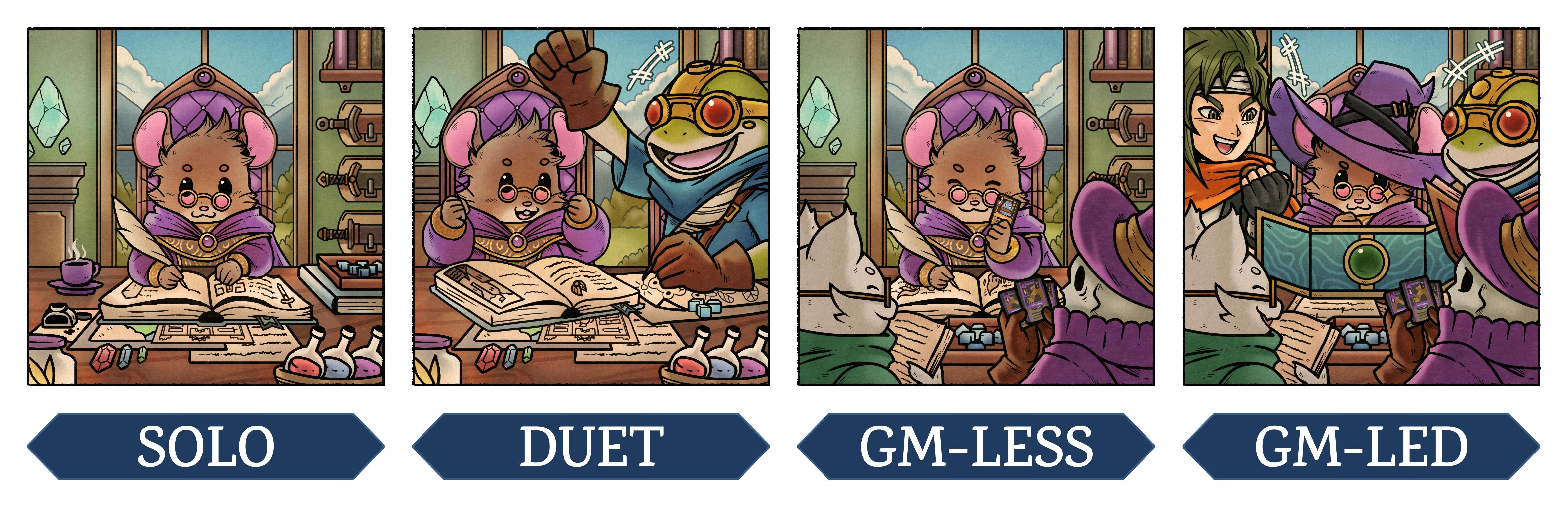 This game is built to how you want to play! Venture alone with guided prompts and structured oracles, share a duet story with a partner, or gather a full table of friends for a traditional campaign. This system supports each mode intentionally with no compromises and no need for a game master (unless you want one)!