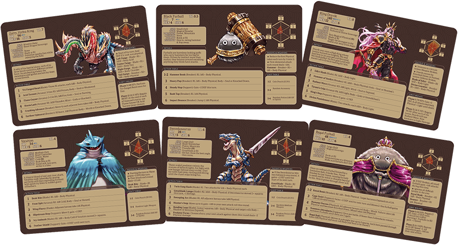 Enemies are designed to be easy to run no matter the game mode you're in! Use their stat cards to quickly understand their roles in combat, the actions they might take, and their general behaviour. Just read the card and you will look like a tactical genius!