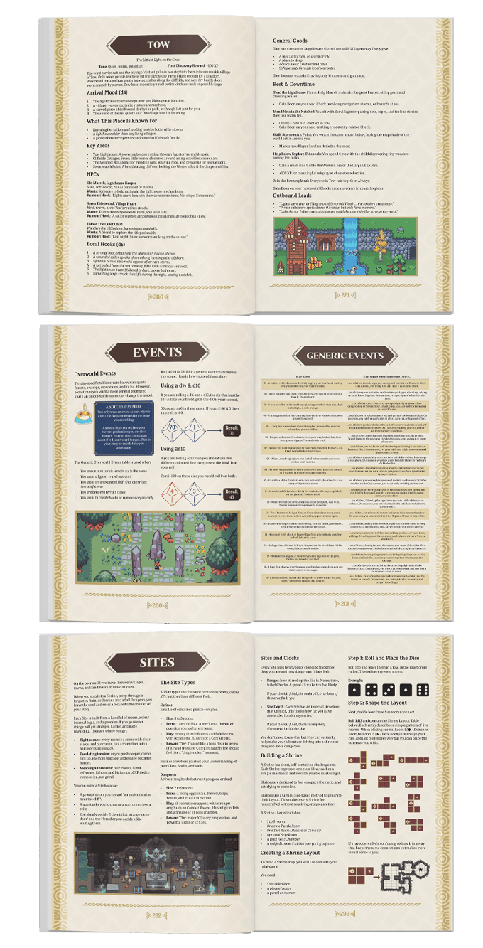 Explore each landmark with unique activities, dialogue and purchasable items. Roll for events using a d100 to experience hundreds of scenarios across 6 different categories (over 600 unique events just for travel). Also delve into Dungeons and Shrines, using a simplified Site Generation system so that each one is unique!