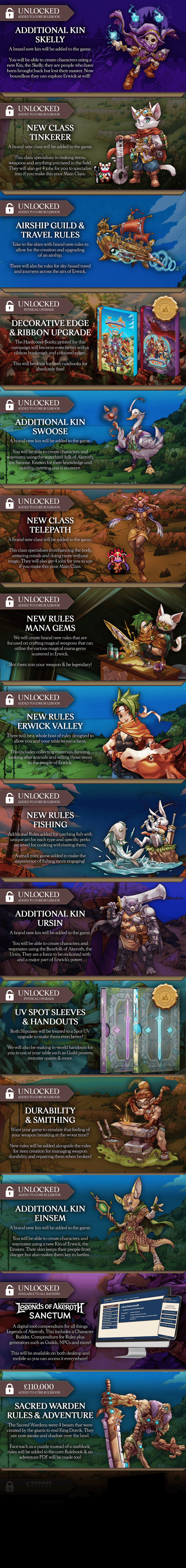 New goals stand before you, each one a milestone that expands the world of Legends of Akeroth. As the campaign grows, so does the scope of what can be created. Think new kins, classes, and adversaries. Every stretch goal is designed to benefit you and deepen your experience.
