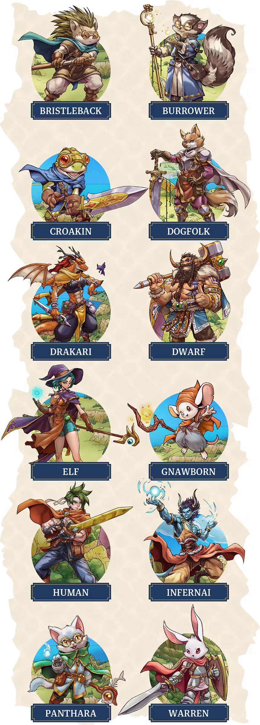 Pick from twelve Kin types, offering distinct traits and perspectives. Will you be a Panthara who moves like poetry along ruined walls and rooftop gardens? Or will you choose to be a Burrower, who are the unseen hands beneath Erwick’s farmlands.