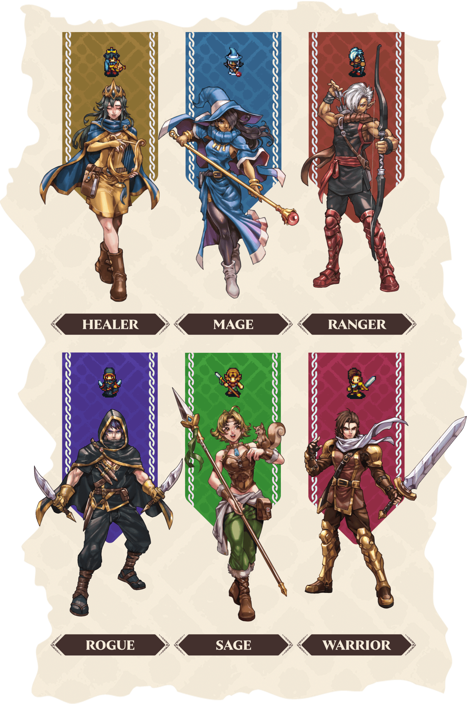 A Class defines how your character interacts with the world. Every adventurer begins with one Class out of the six available. As you grow, you can learn others, blending strengths to create something entirely your own. You aren't limited to a set level and can mix any classes together to make your own unique build. Truly an infinite amount of customization!